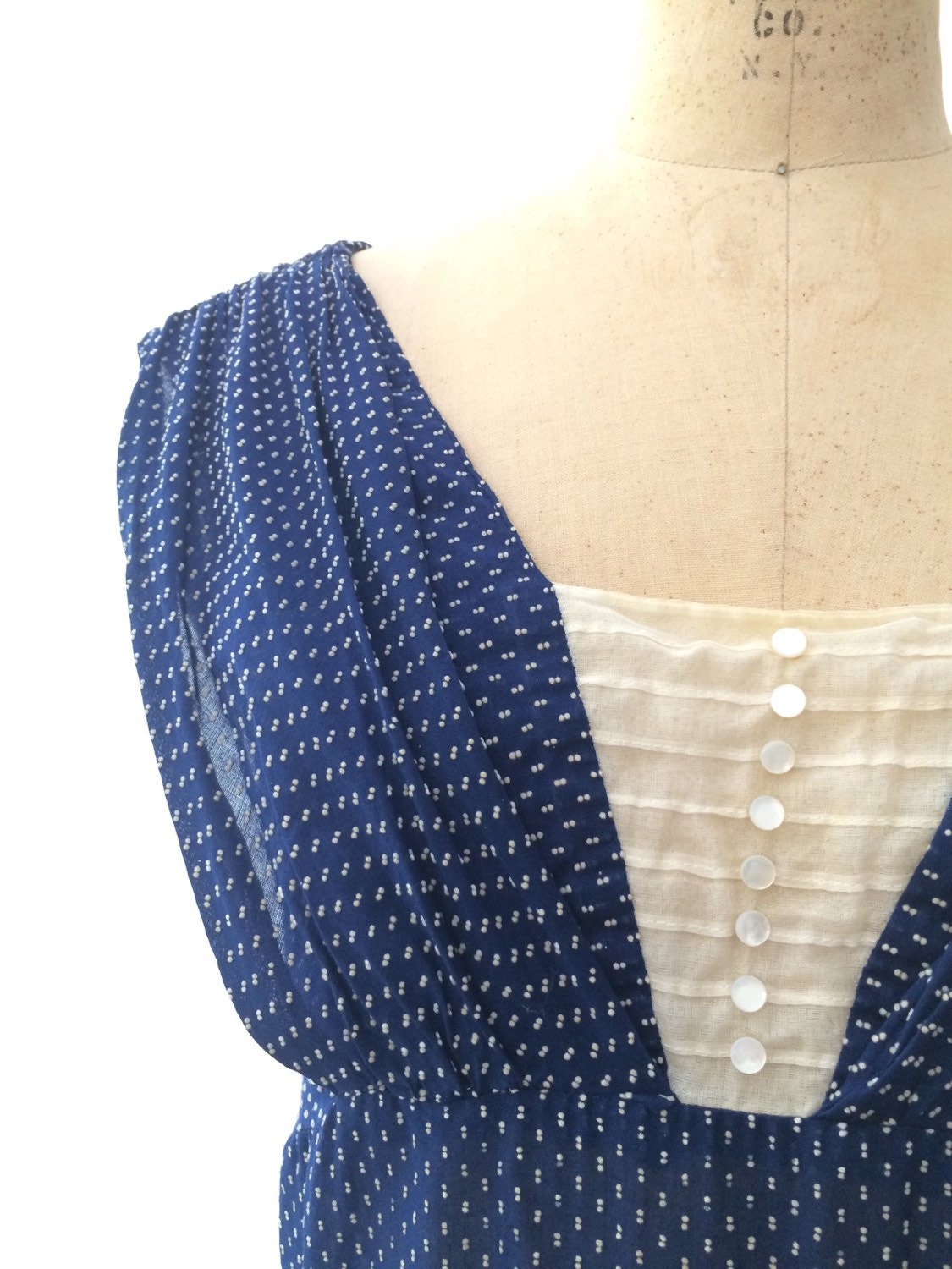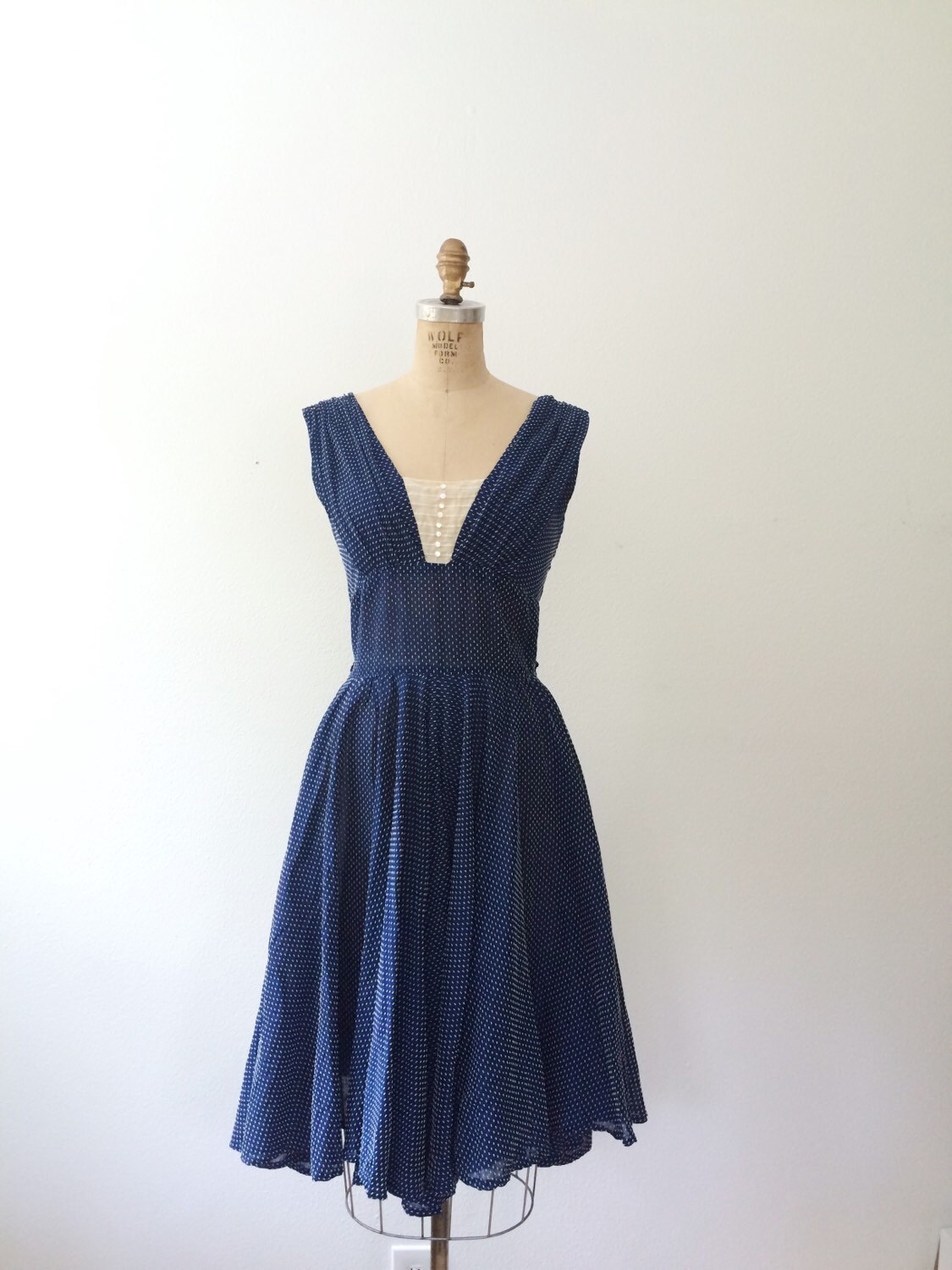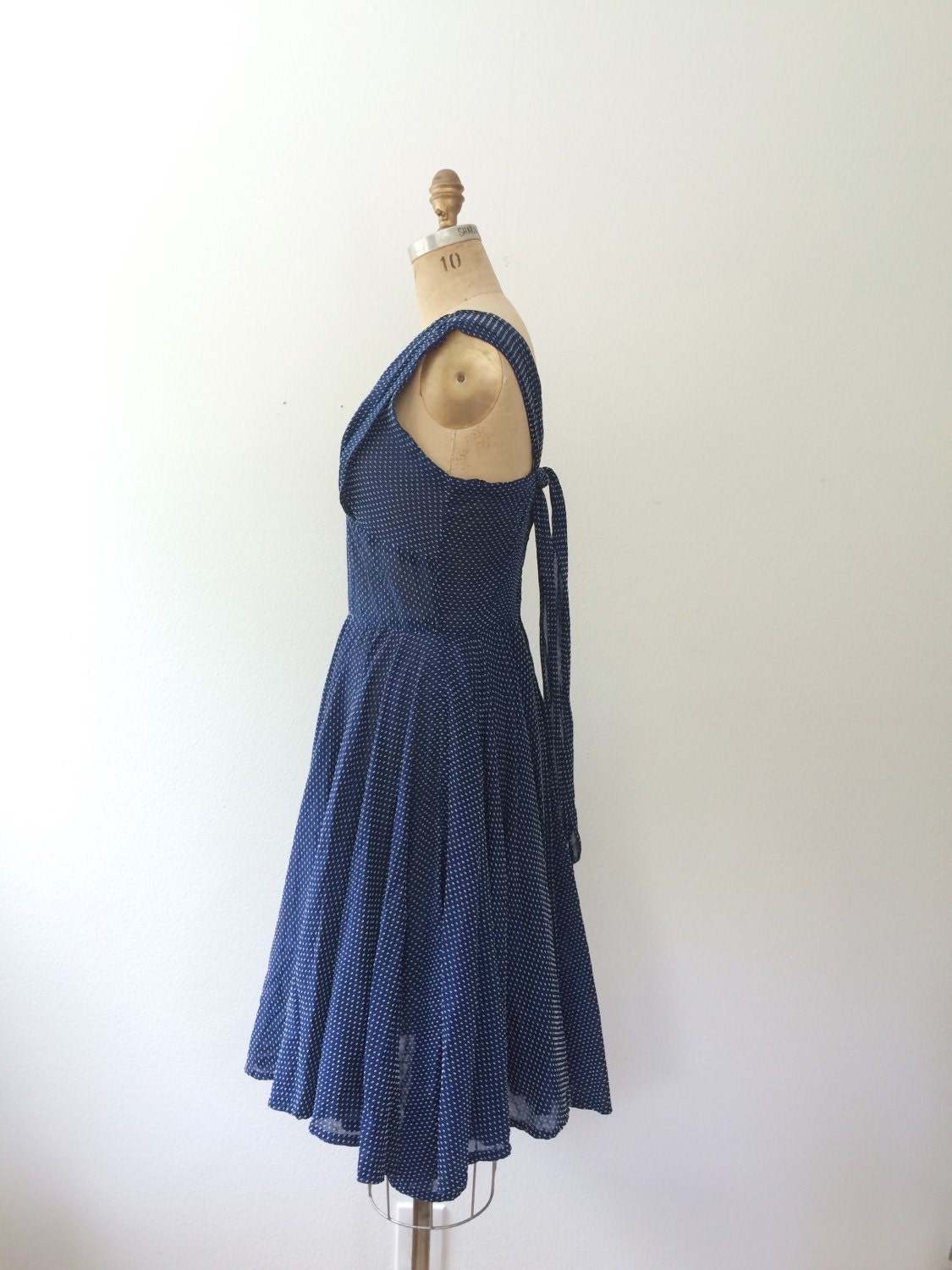 Very sweet neckline with double layered shoulders, gathered fabric attaches at bust and falls over to the back and creates a tie at top of zipper