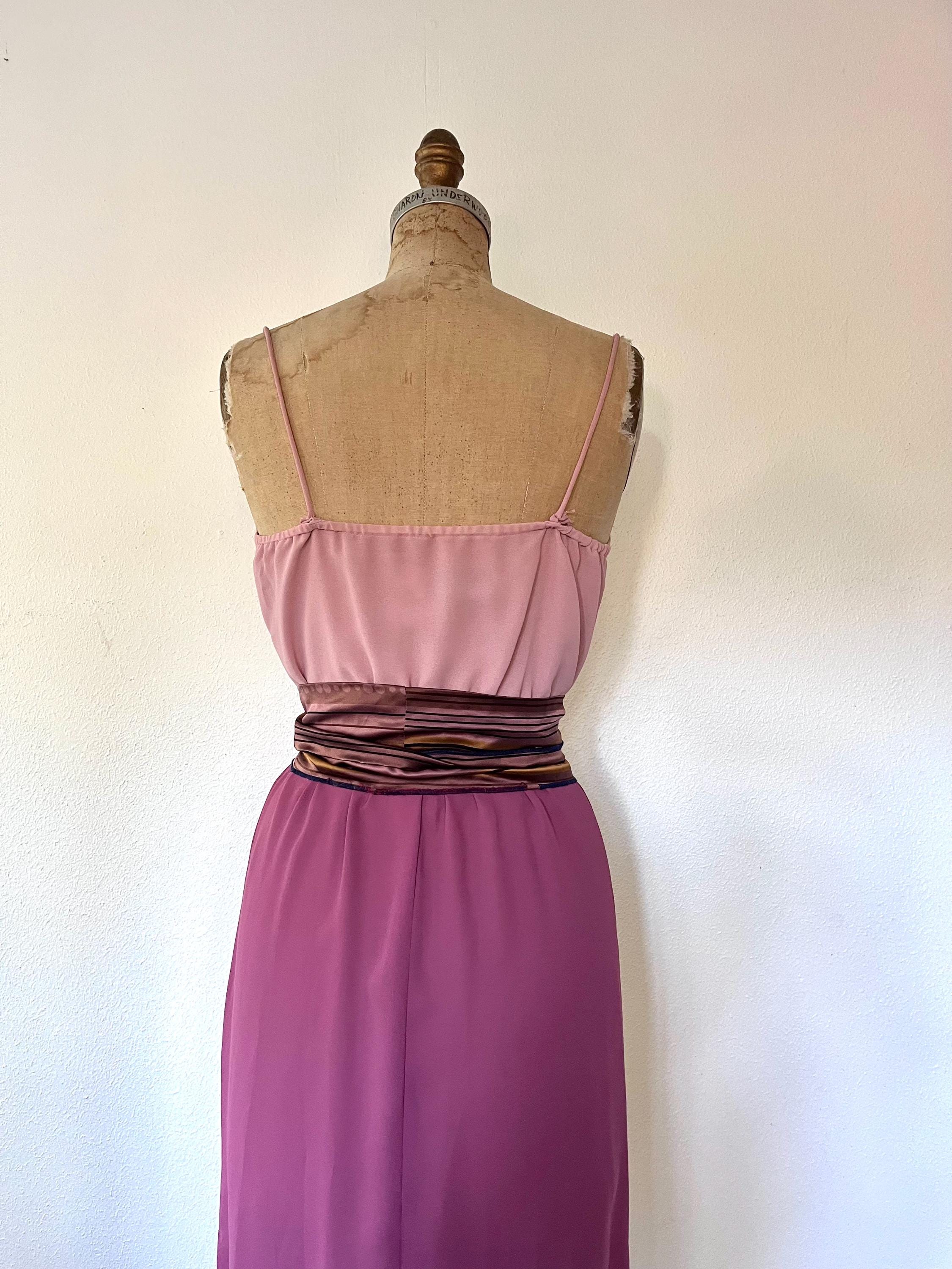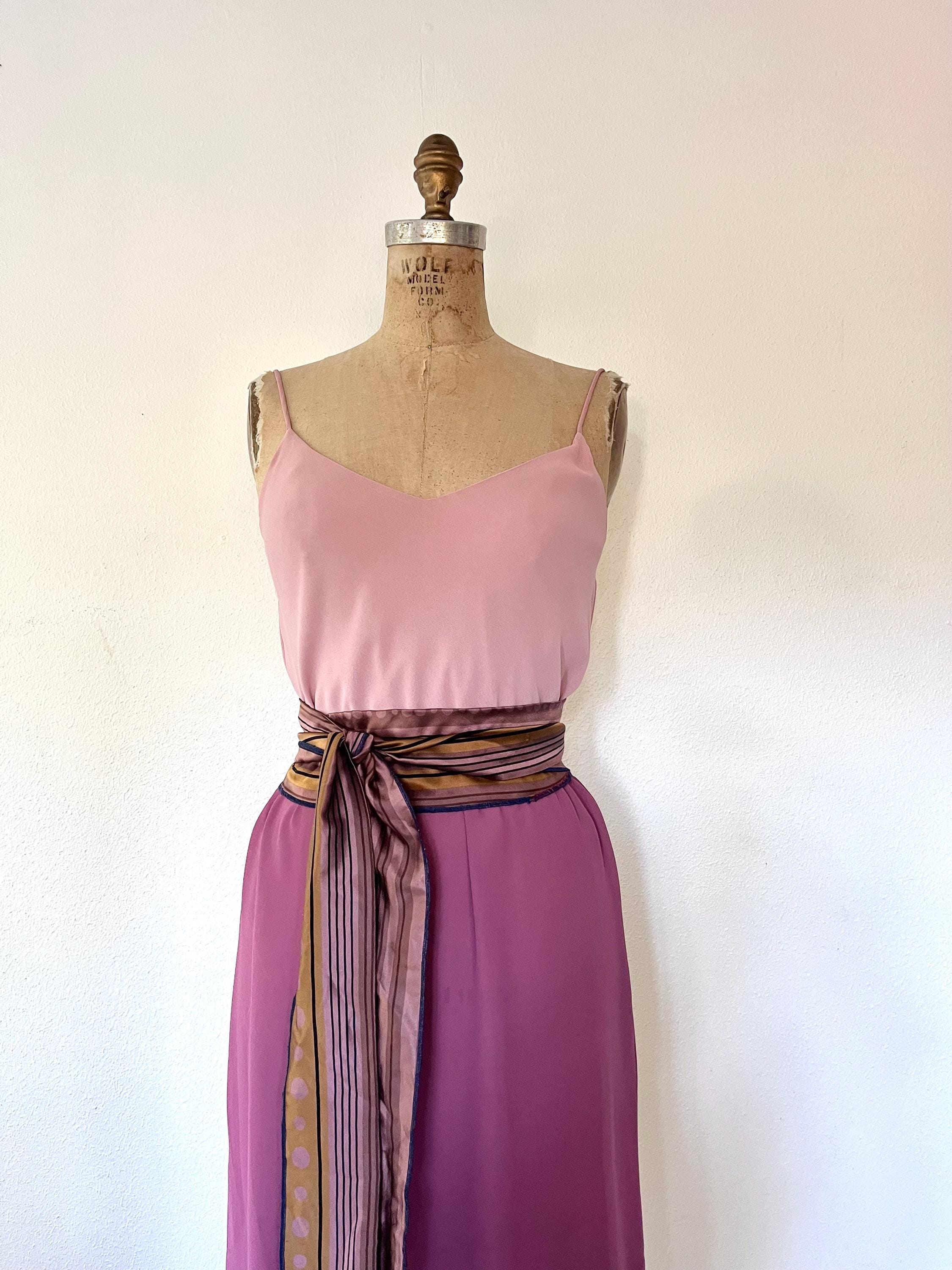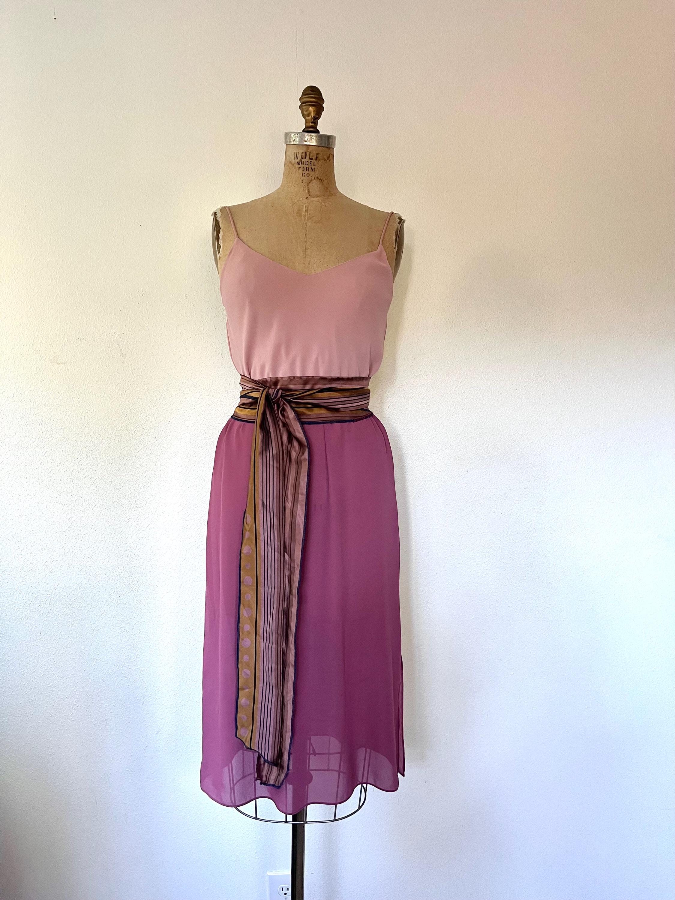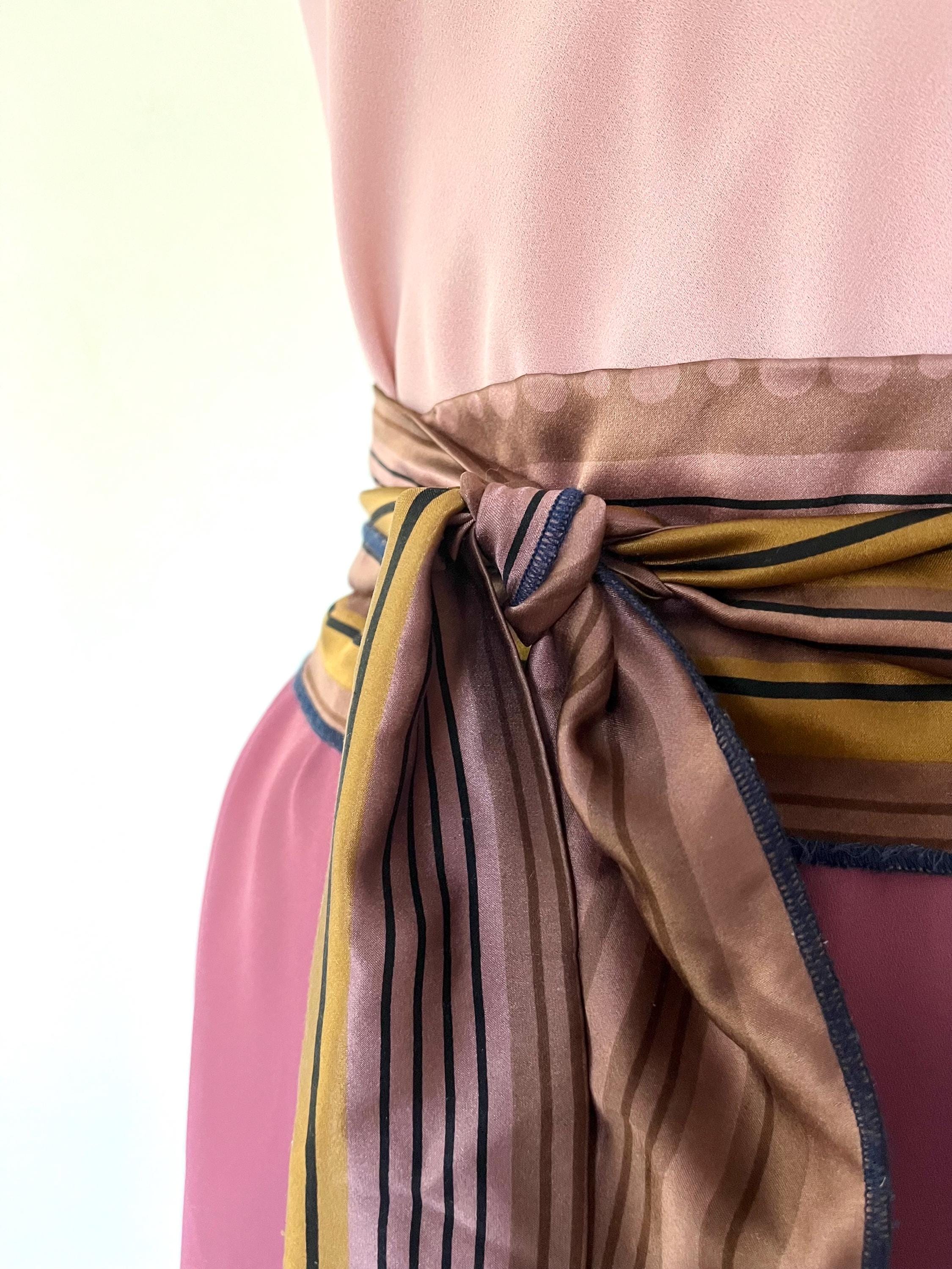 no original belt but I've added a pretty silk sash with matching and contrasting colors that will be included in the listing!