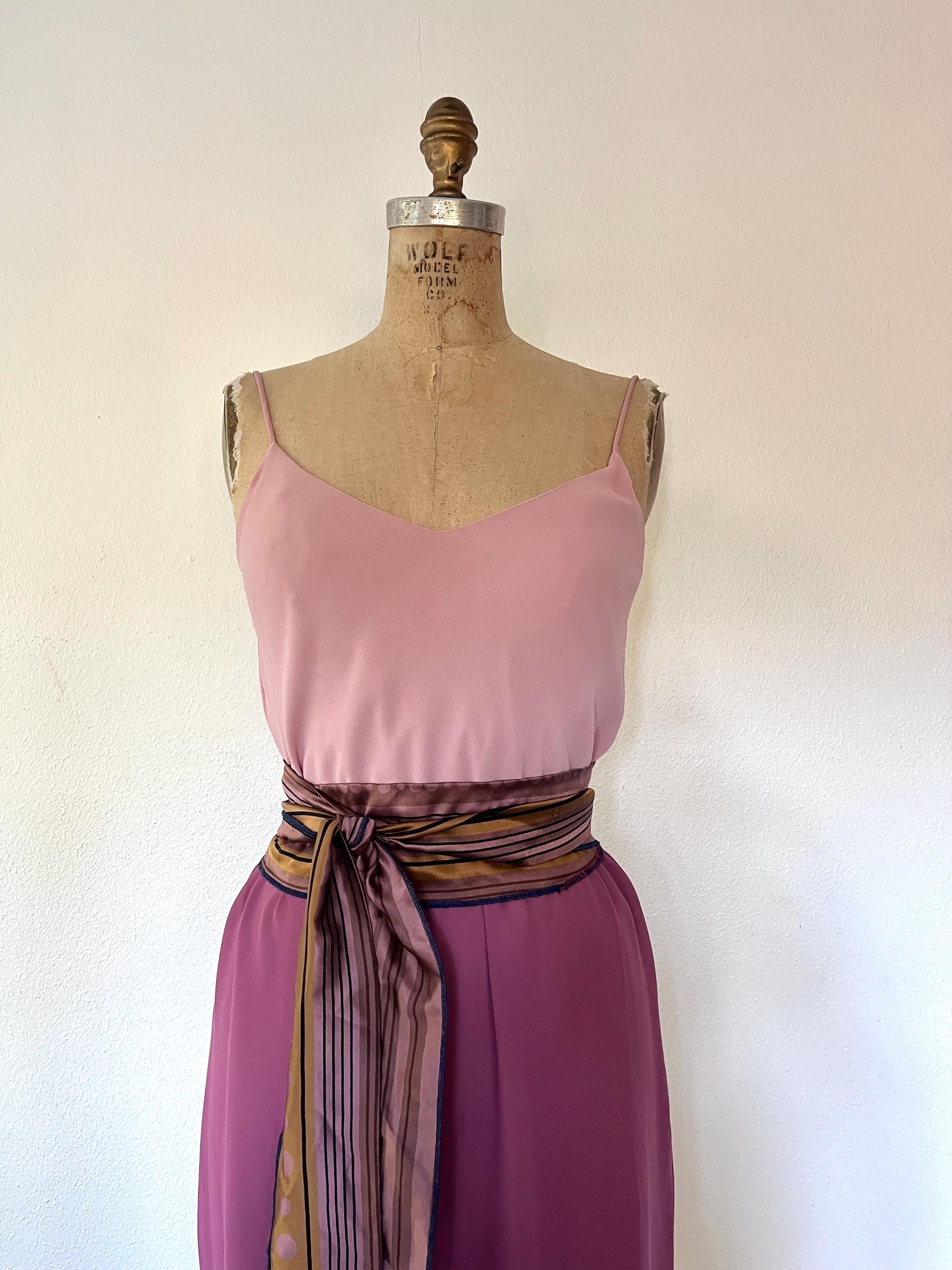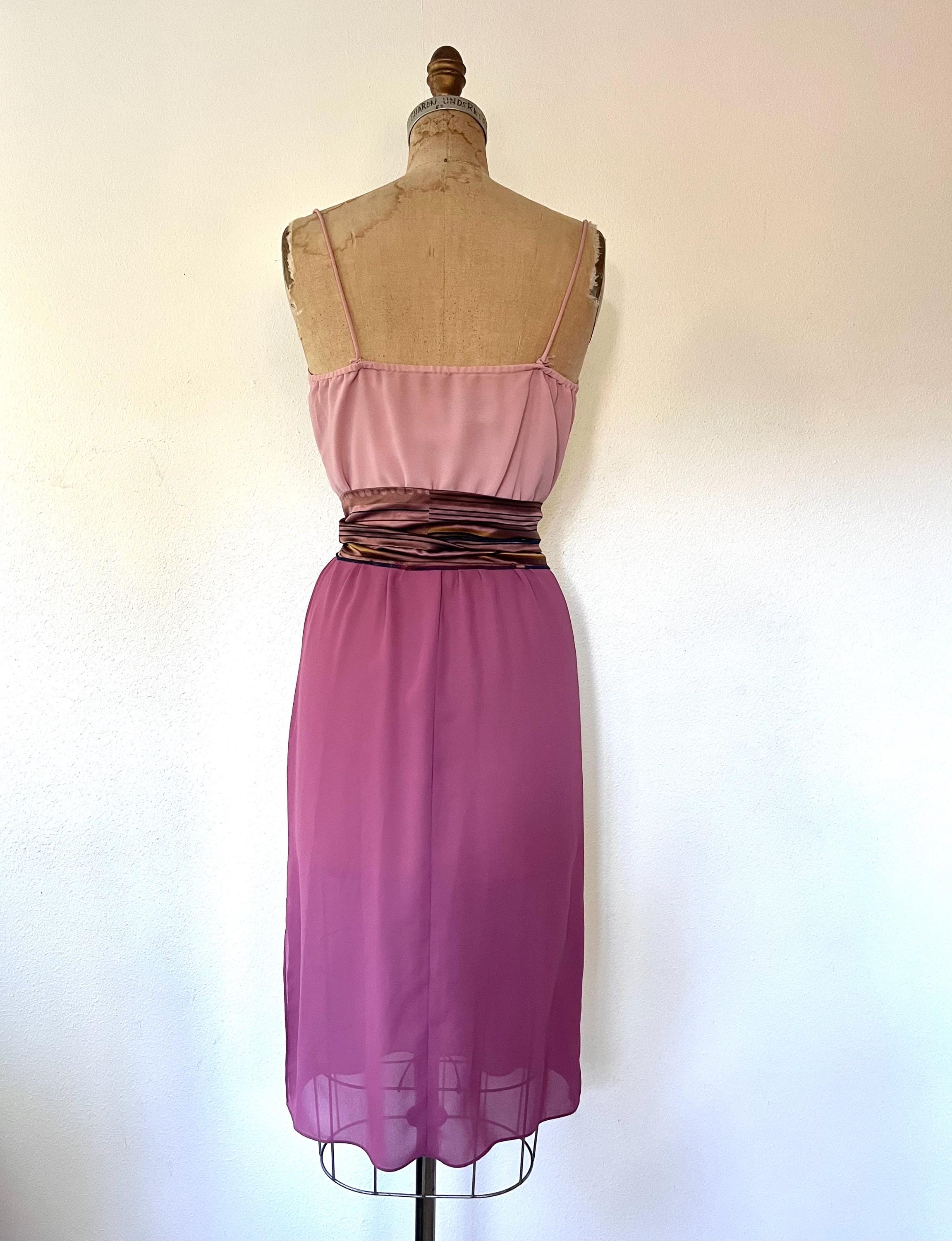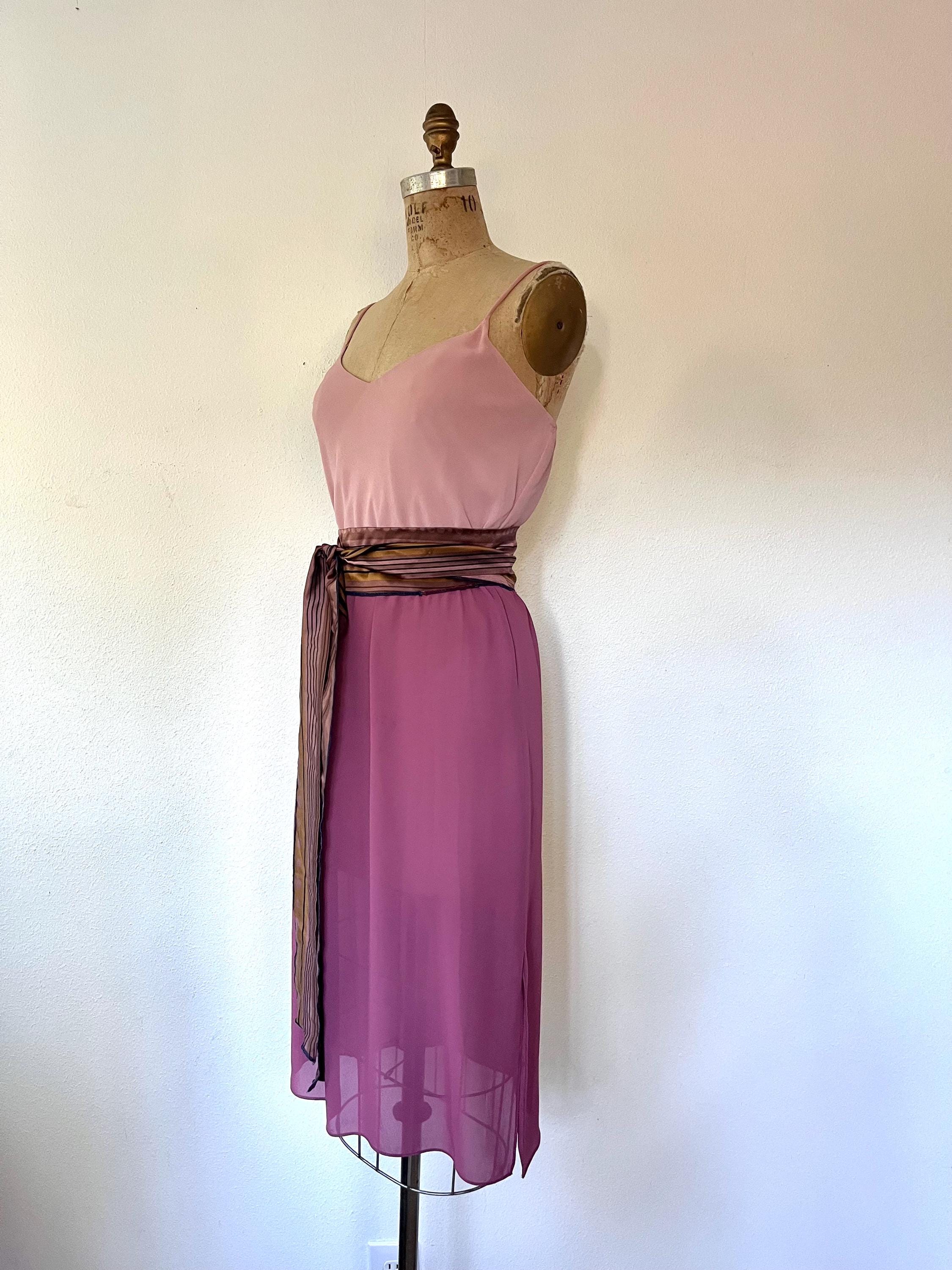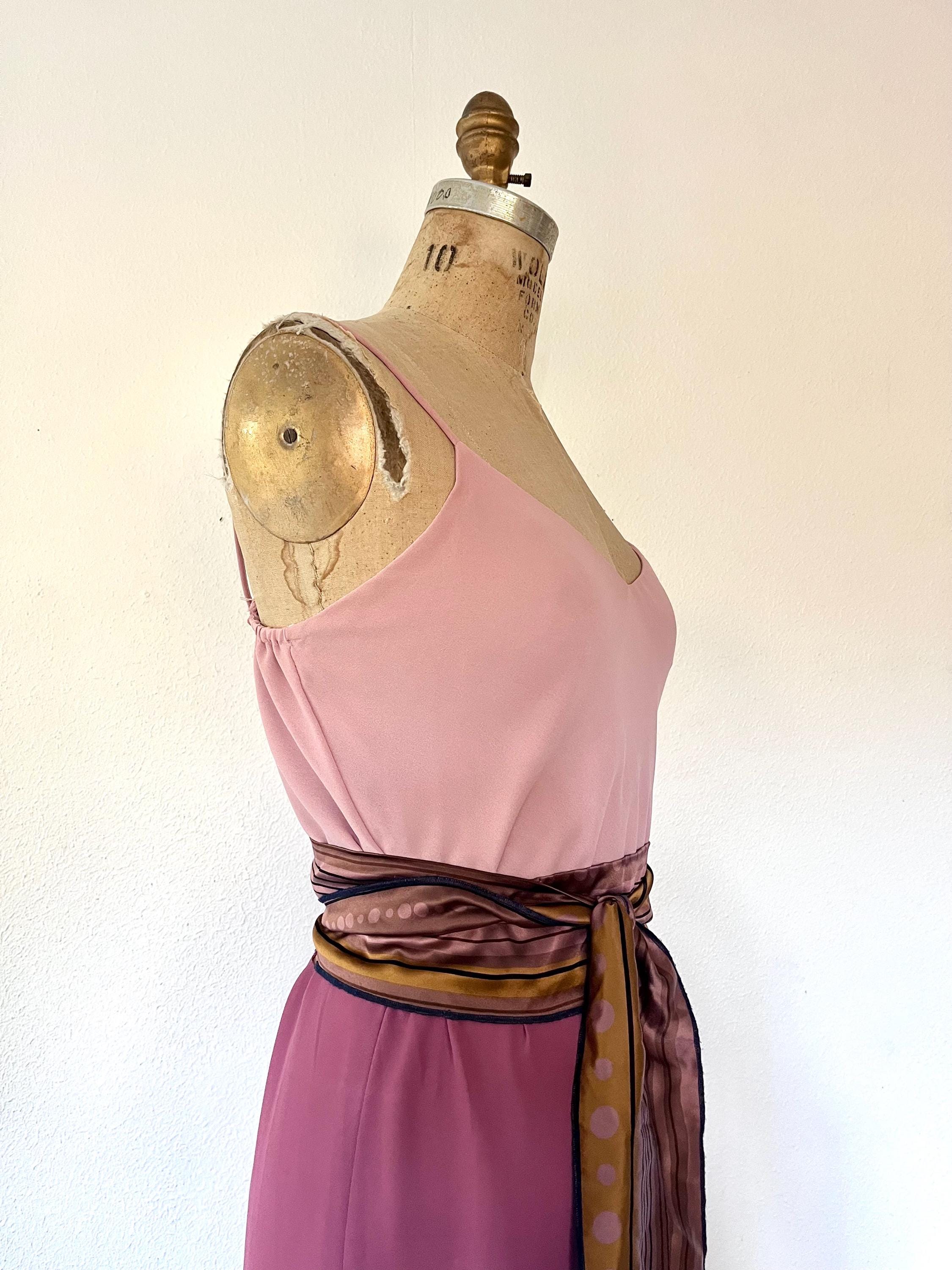 no original belt but I've added a pretty silk sash with matching and contrasting colors that will be included in the listing!