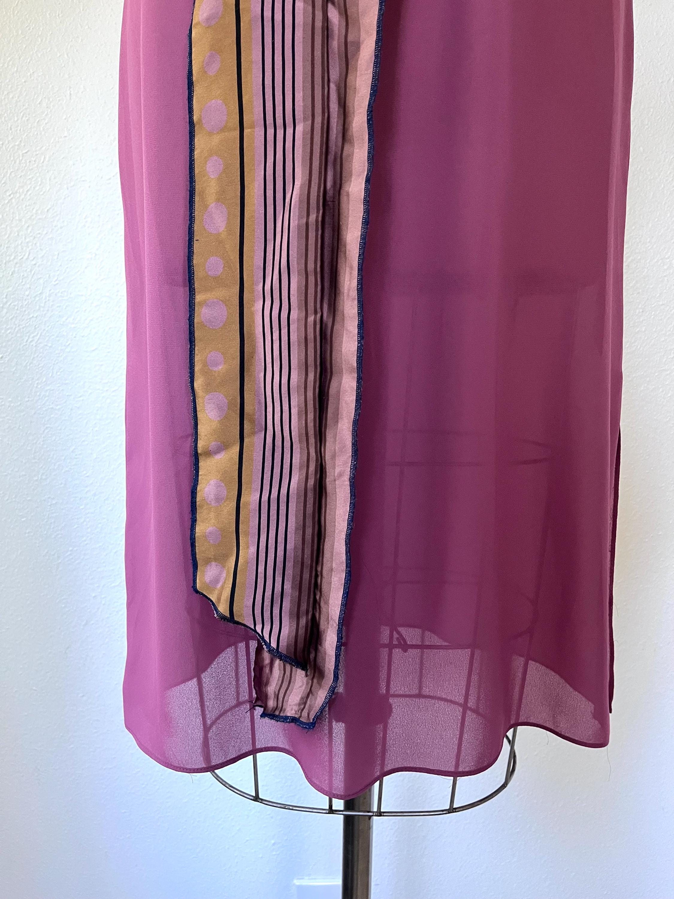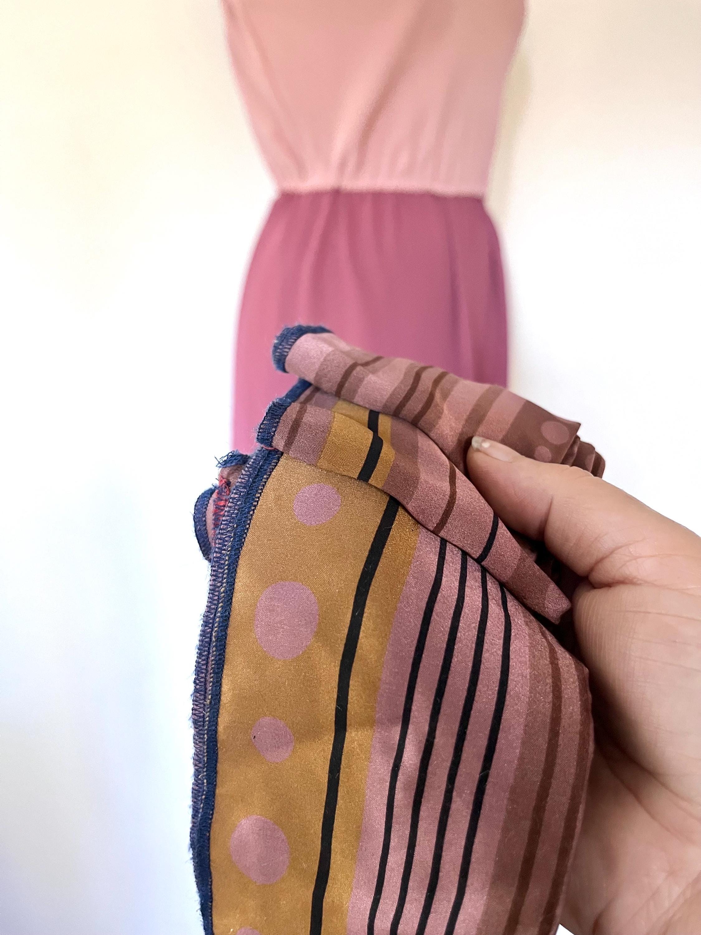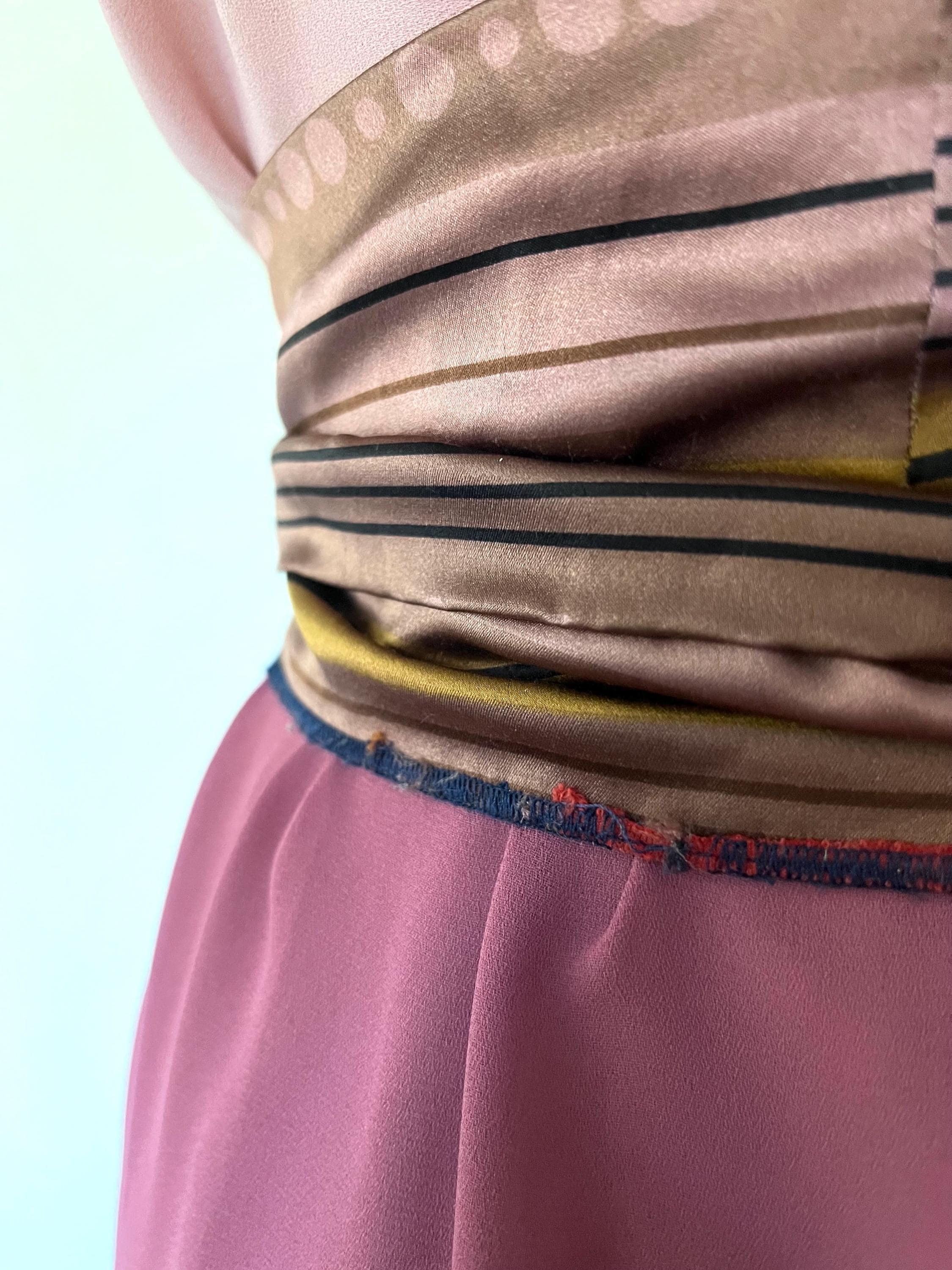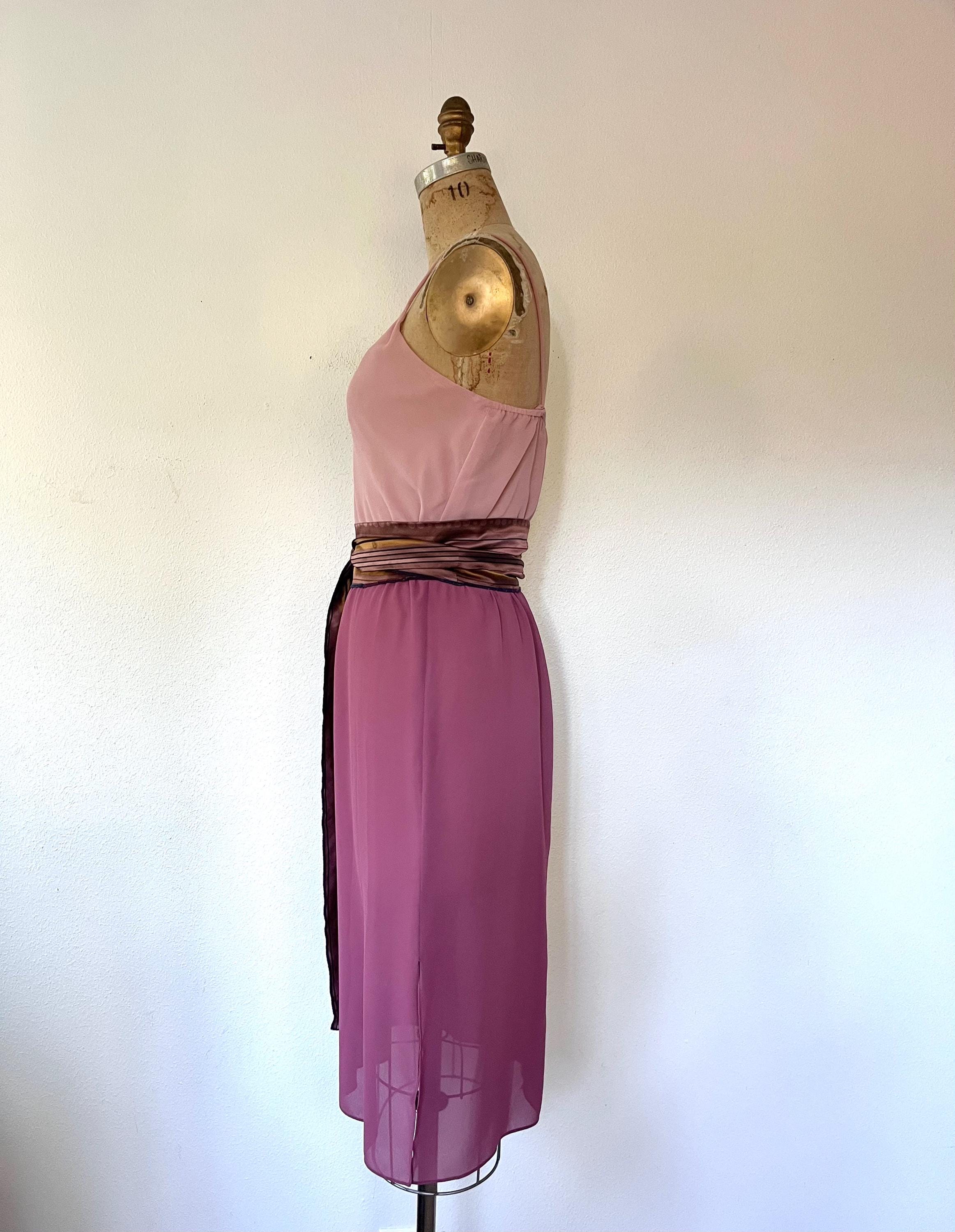 no original belt but I've added a pretty silk sash with matching and contrasting colors that will be included in the listing!