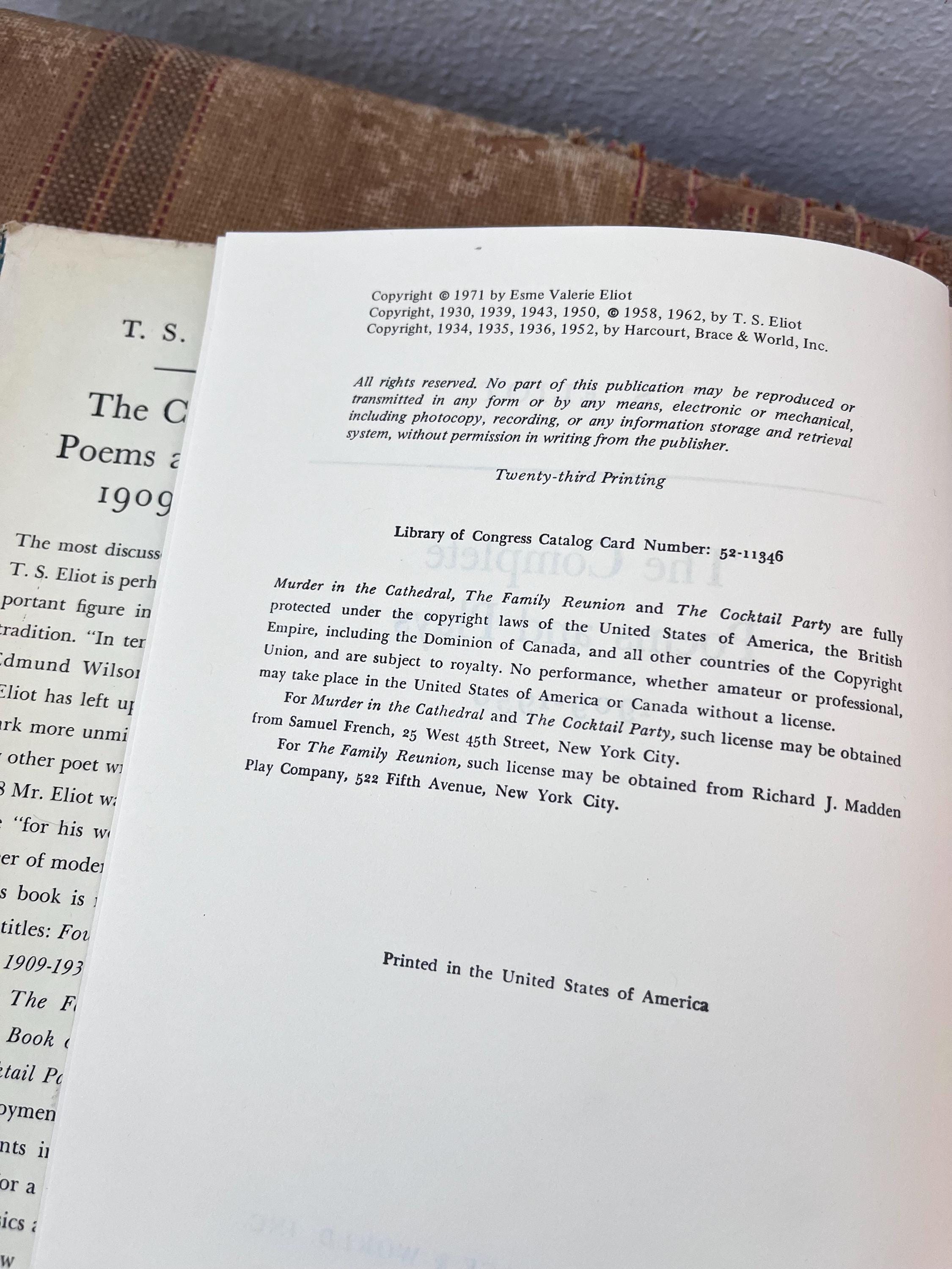 vintage copy of T.S. Eliot's "The Complete Poems and Plays " 1909-1950