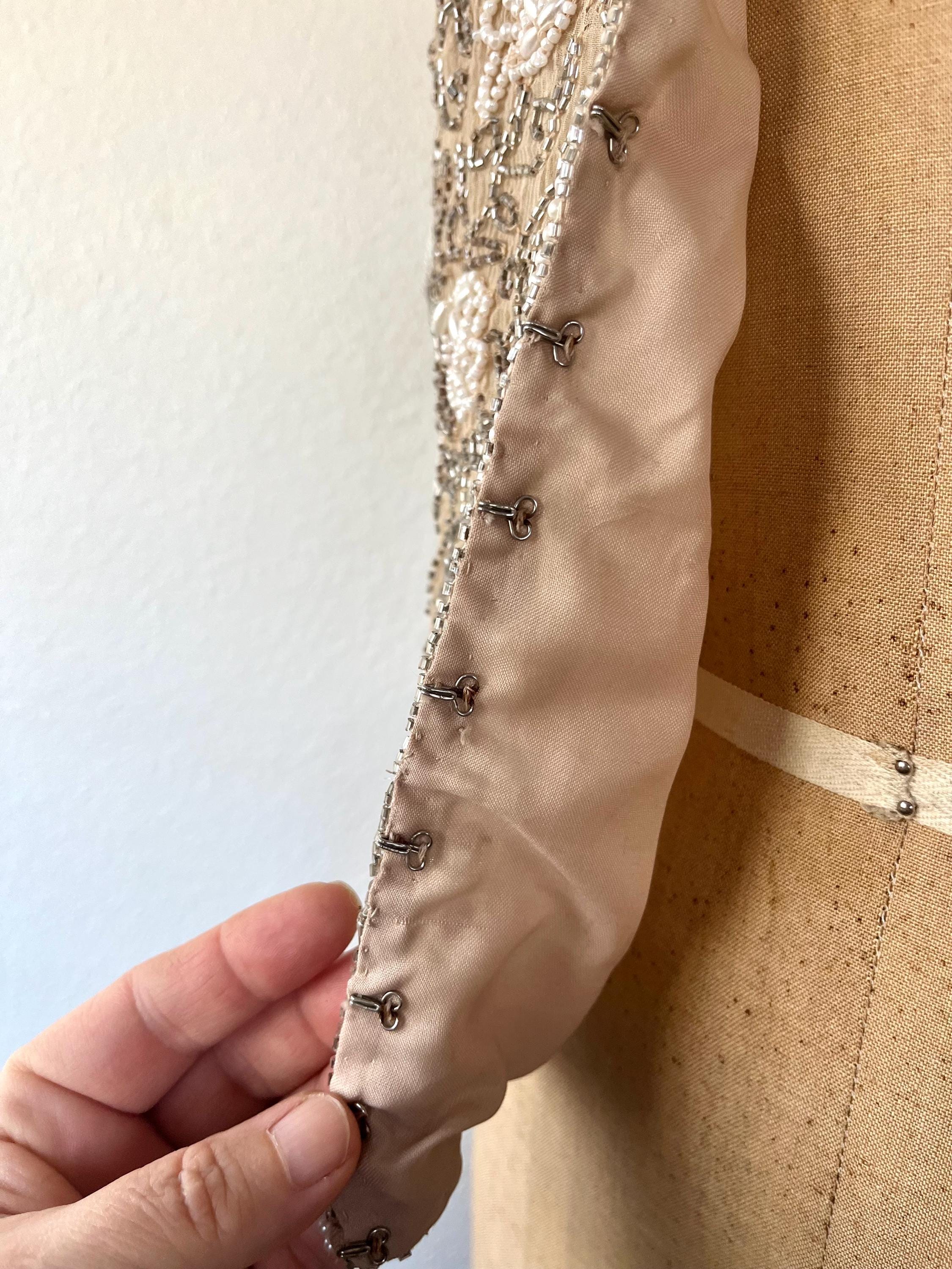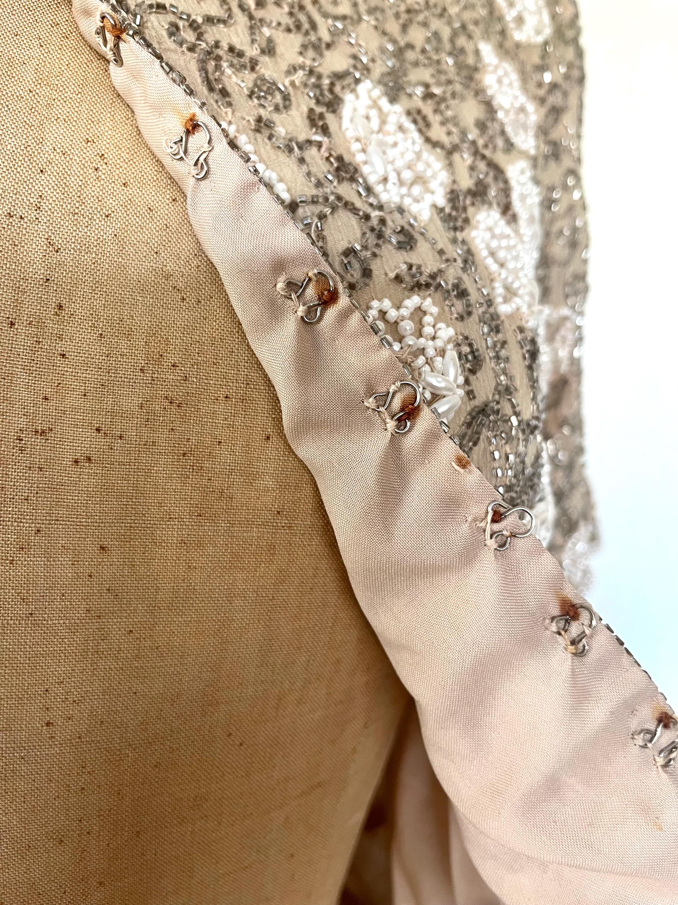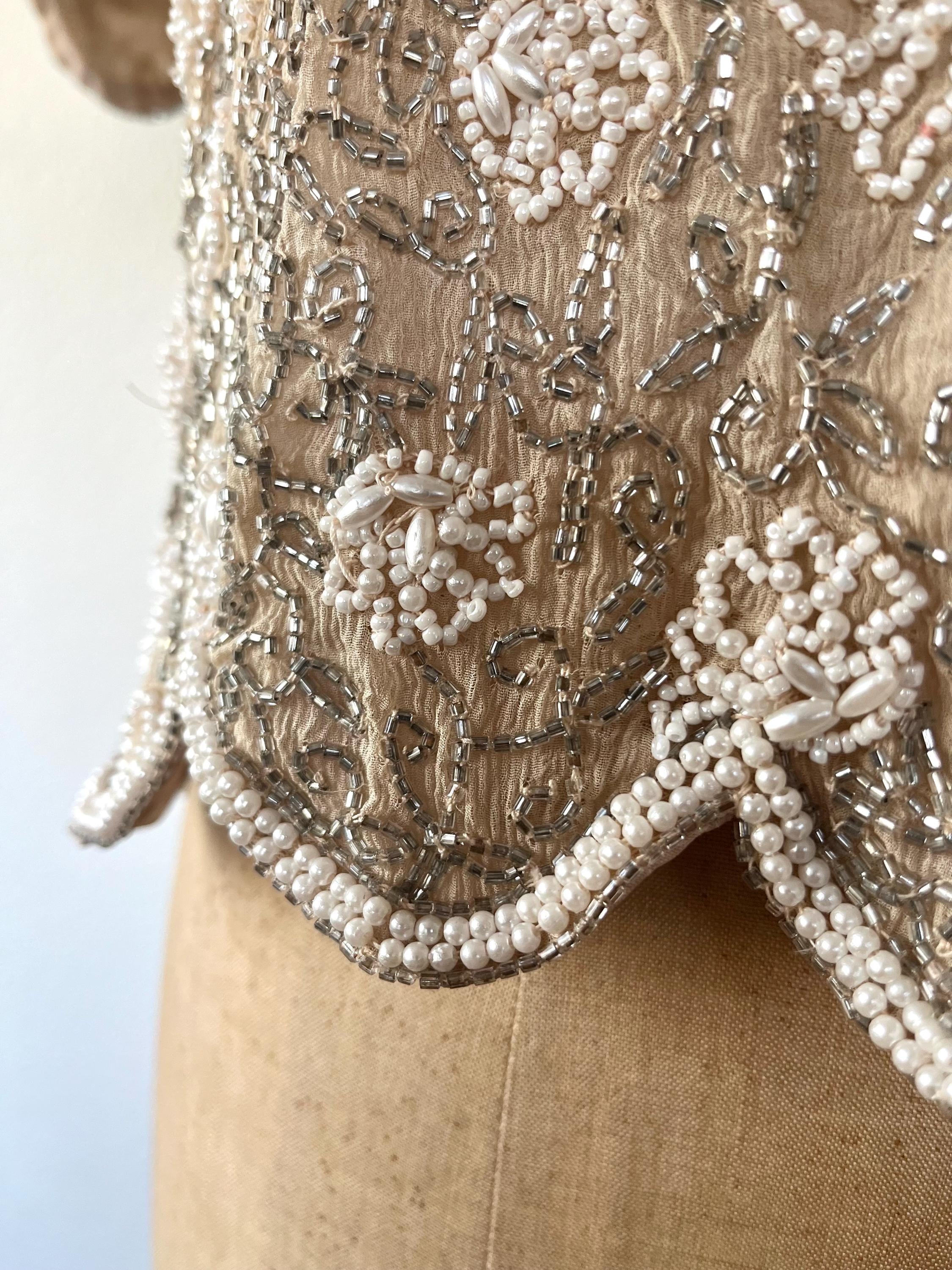 champagne silk with a gorgeous floral pattern in silver beads and pearls