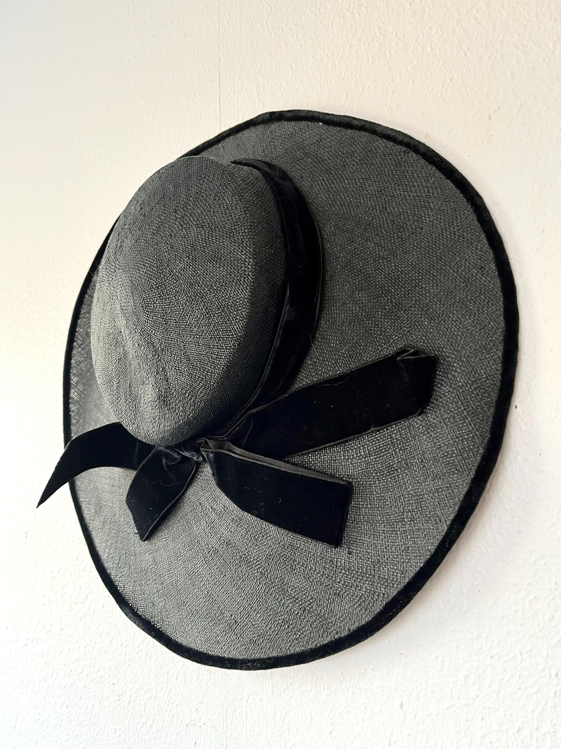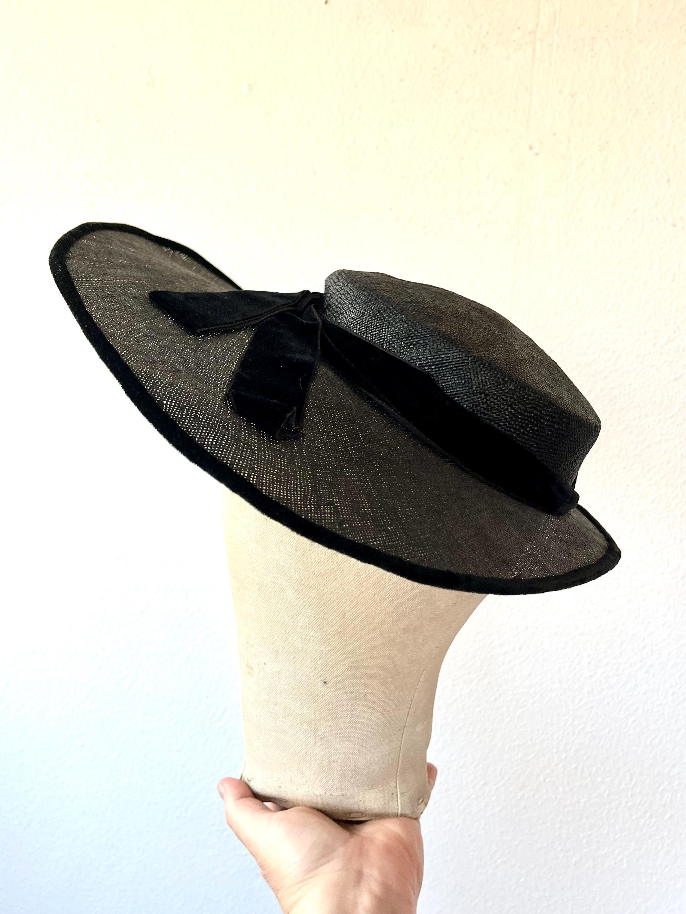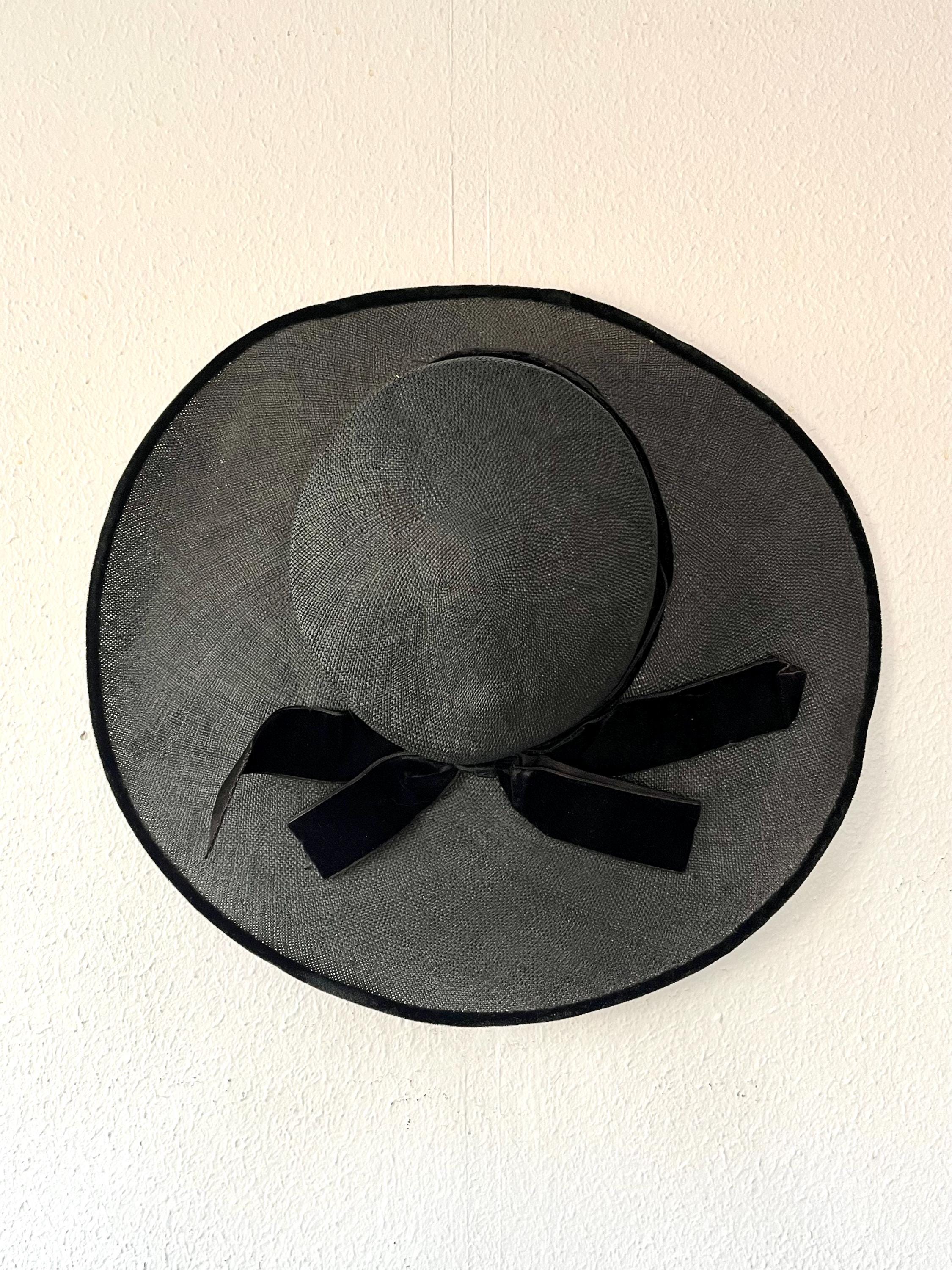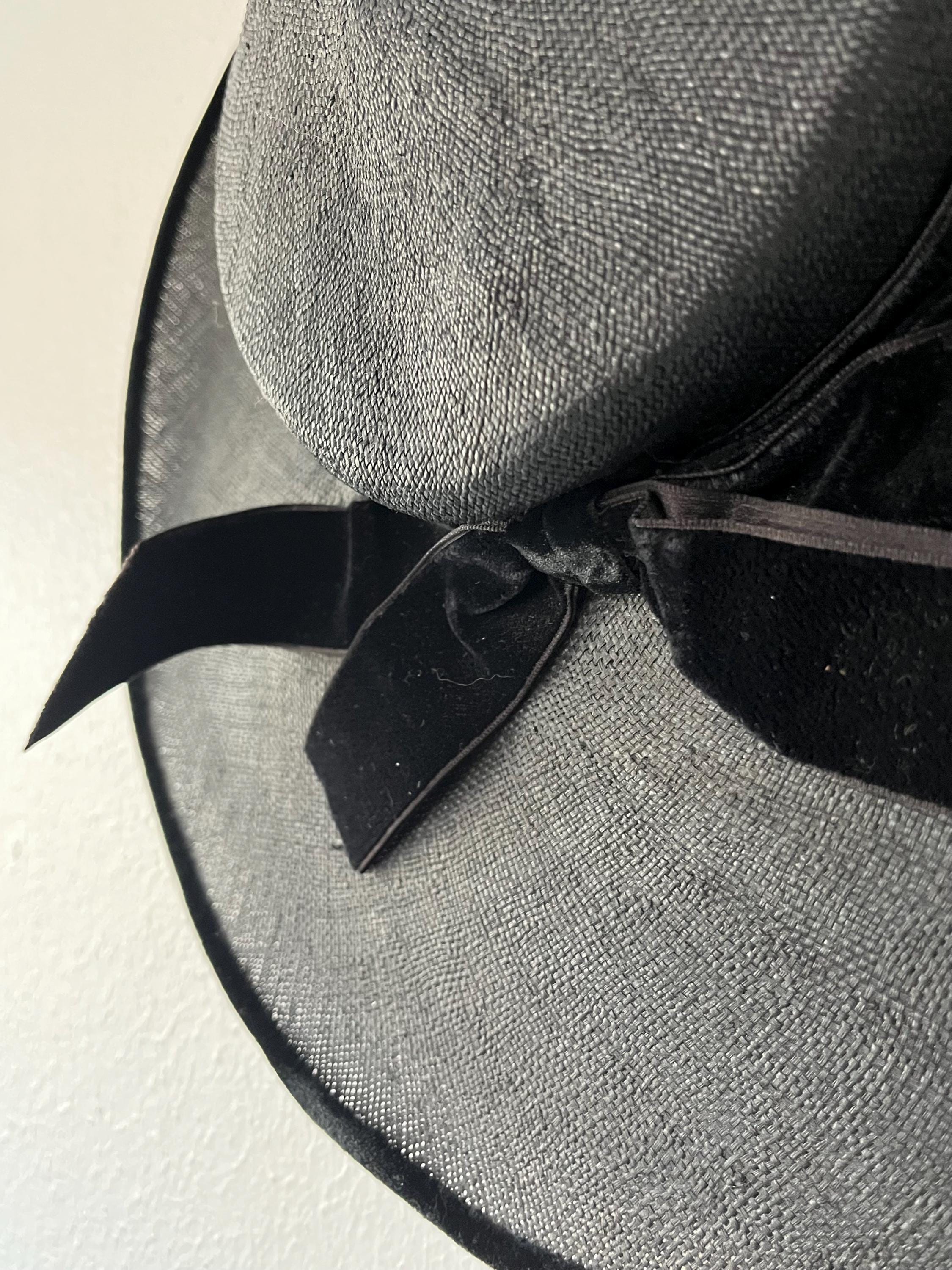 black wide brim straw hat with a velvet bow