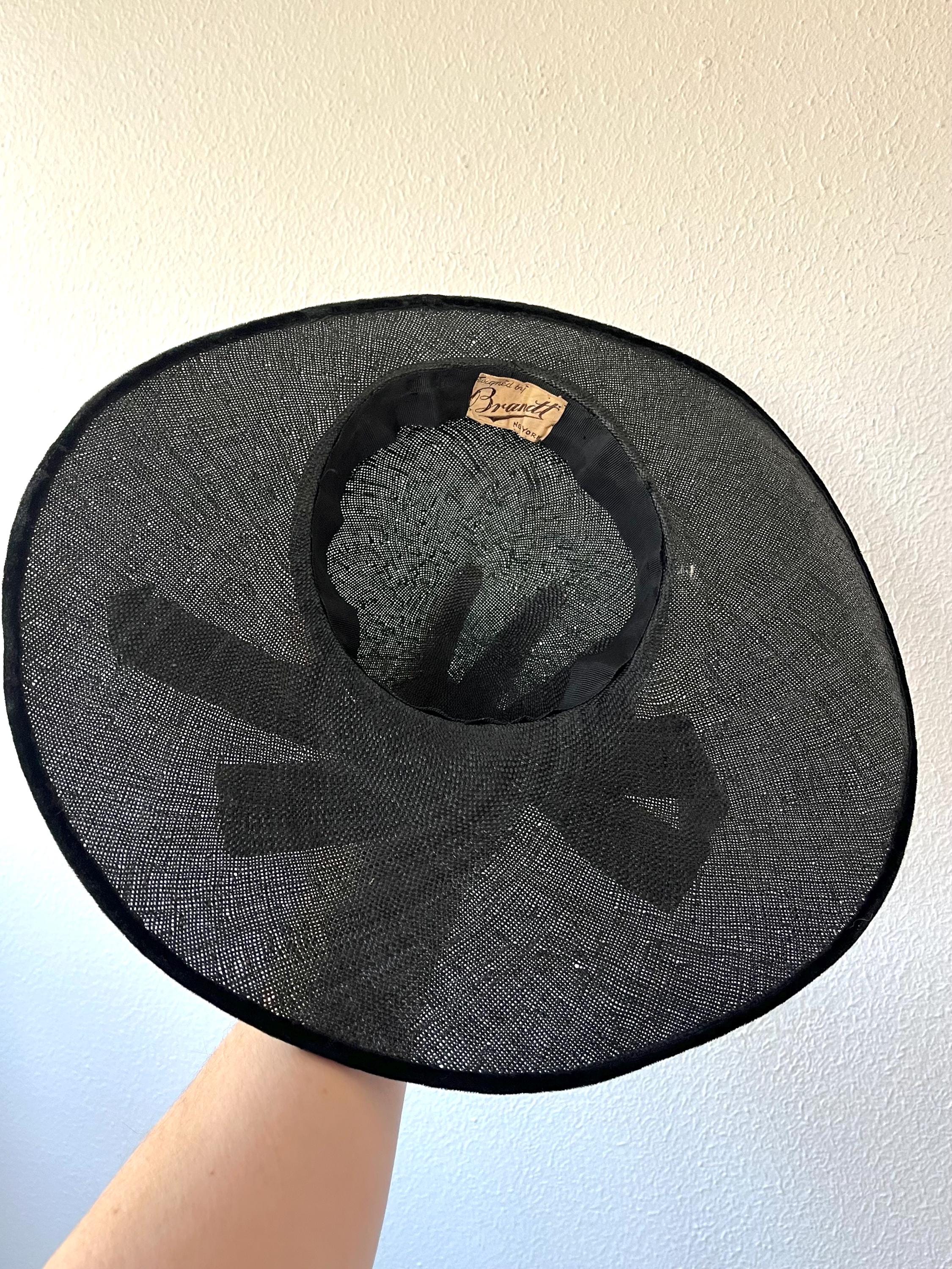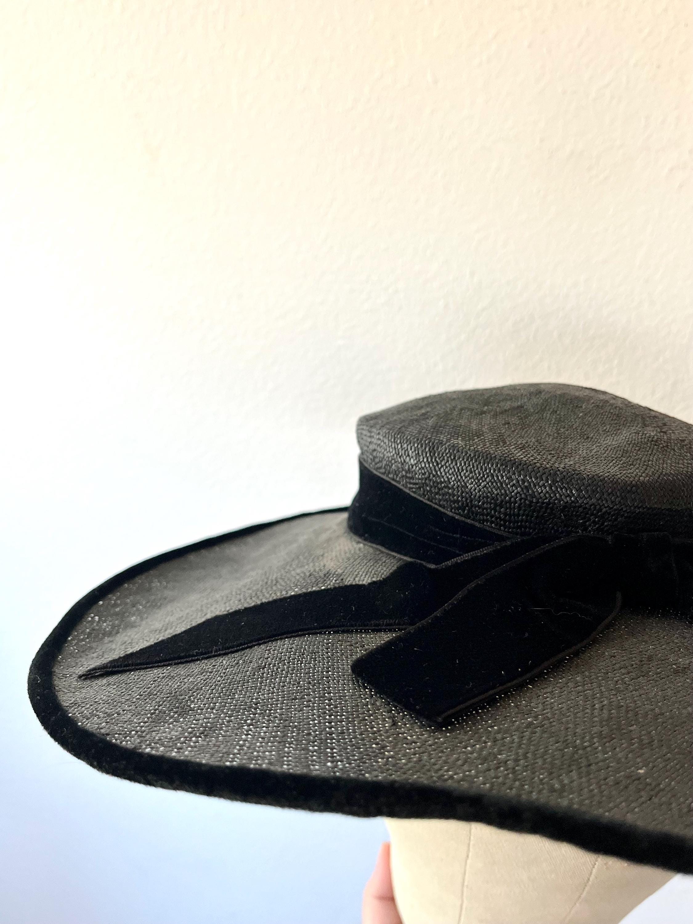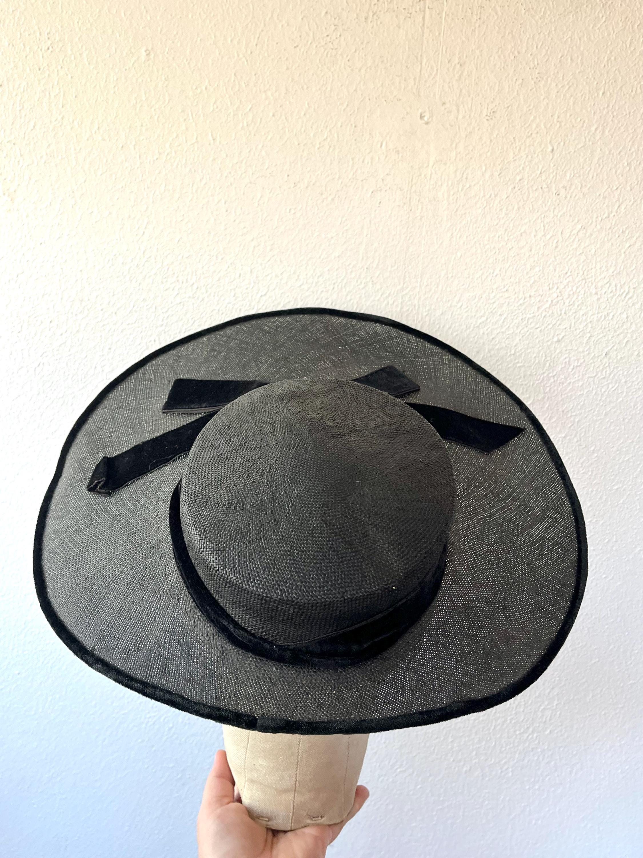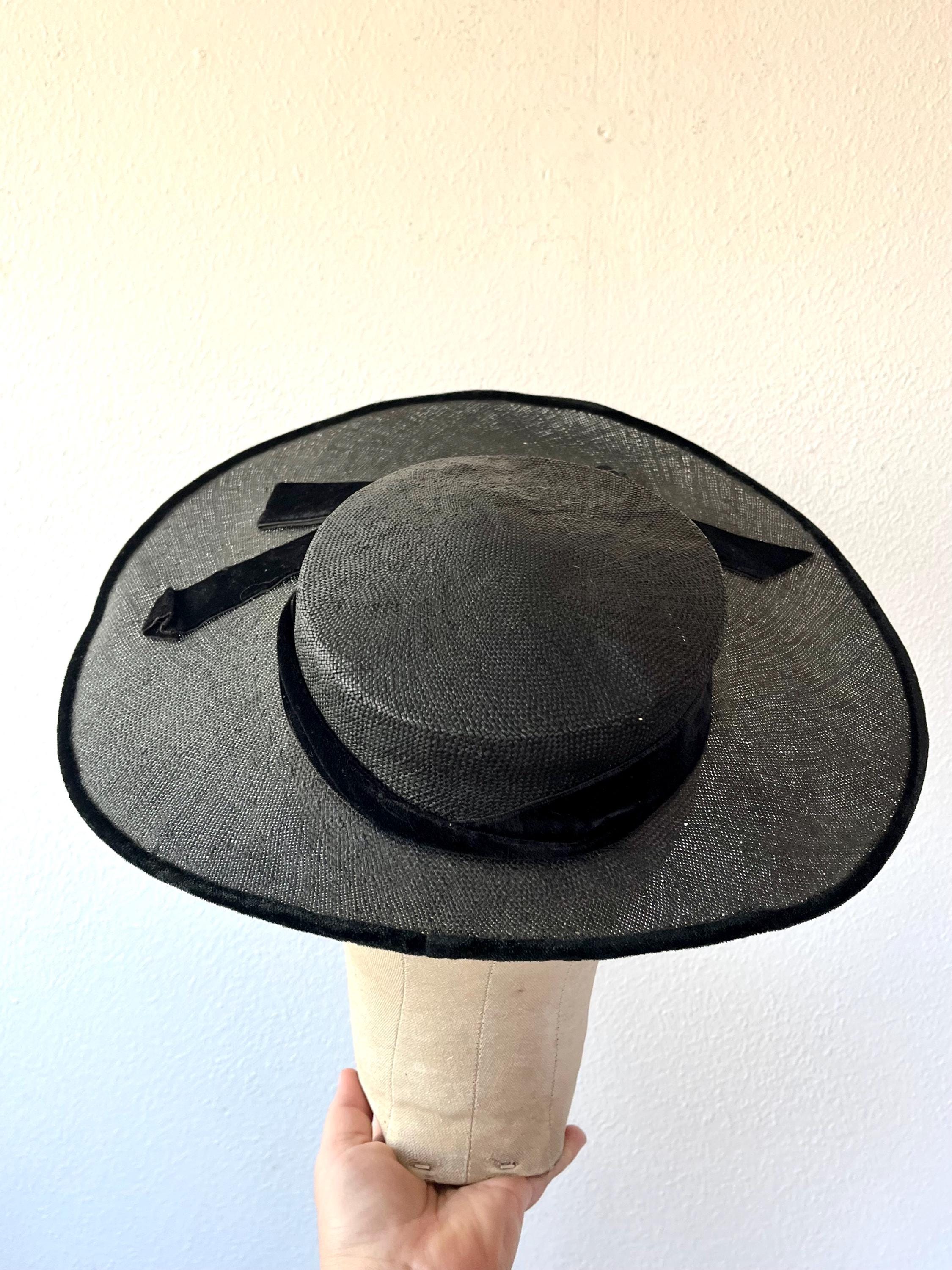 black wide brim straw hat with a velvet bow