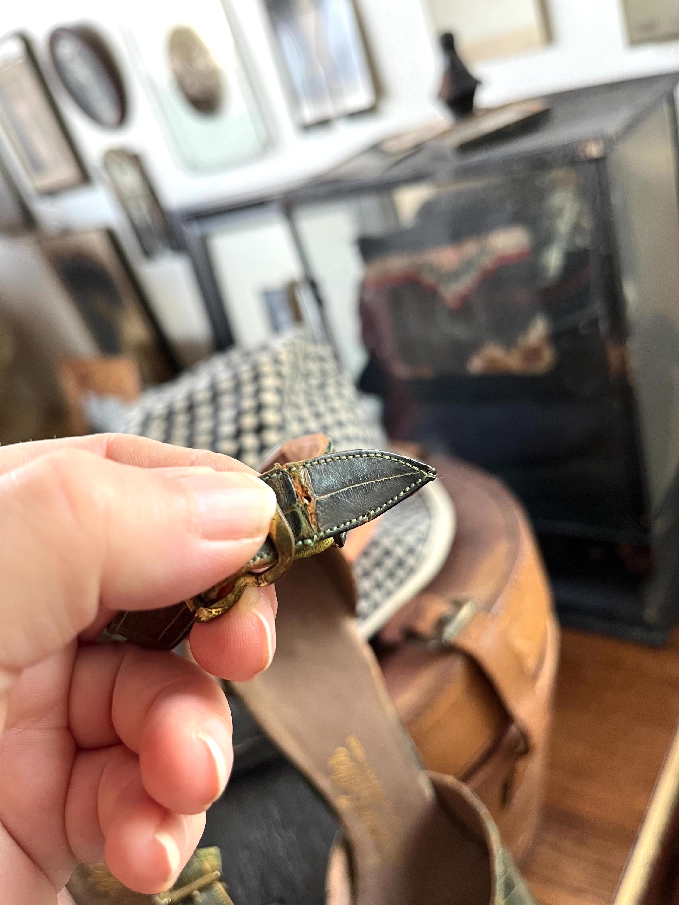 wear to the leather sole, some fading, stress to leather straps (crack in top leather in two small place of straps, area is lined and sound in structure however)