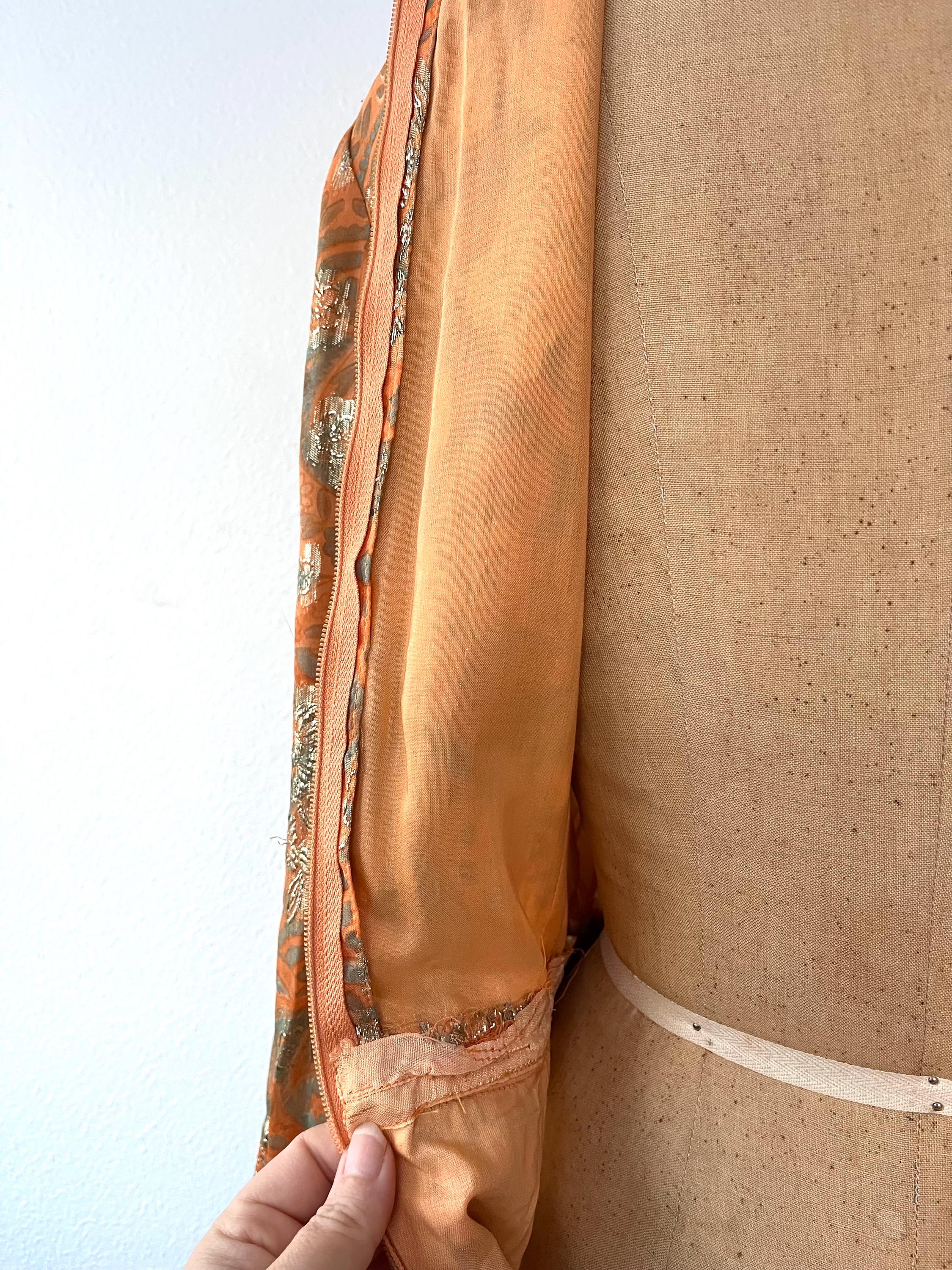 Features beautiful sheer printed silk chiffon in a soft persimmon with grays and blues