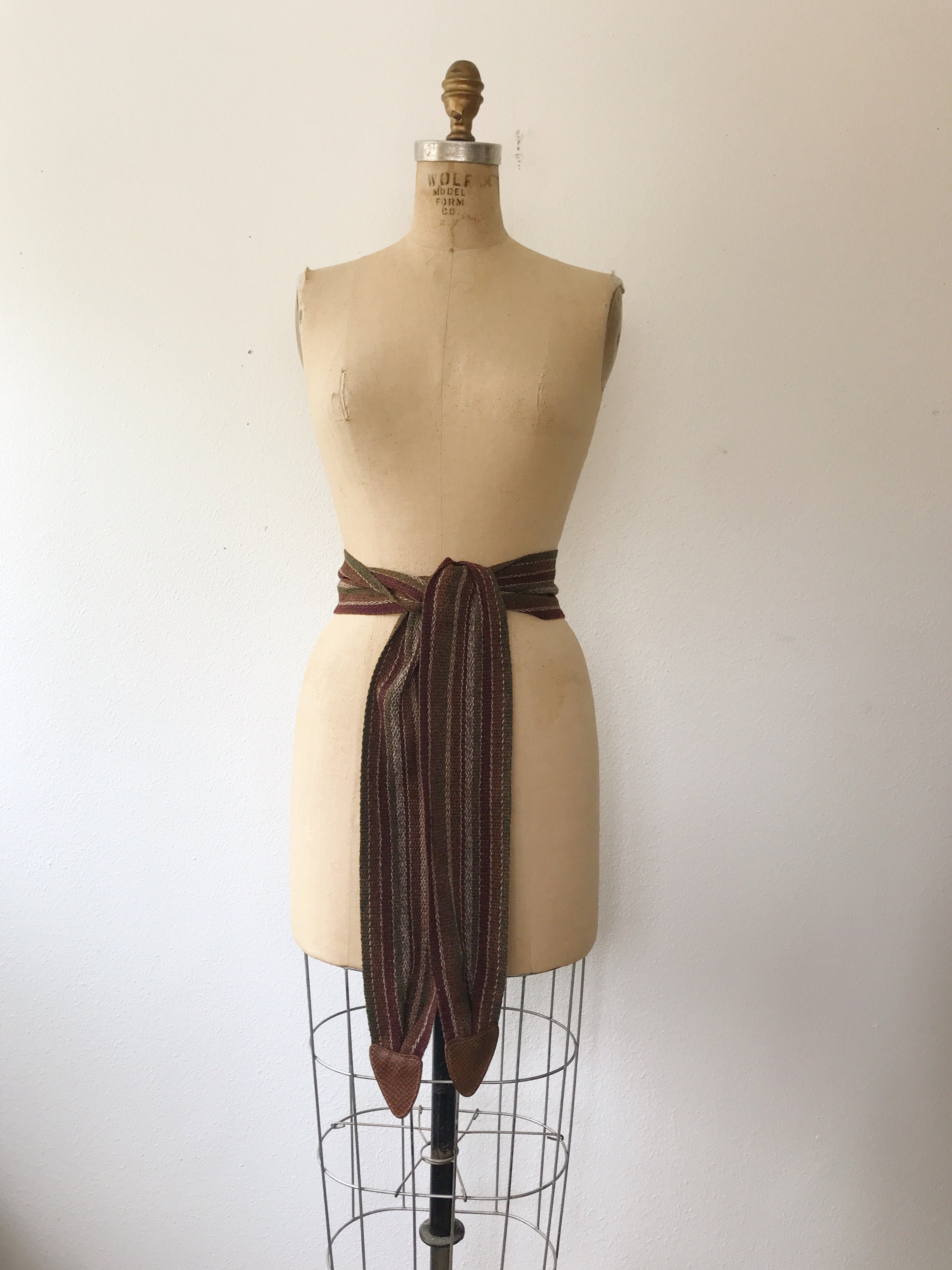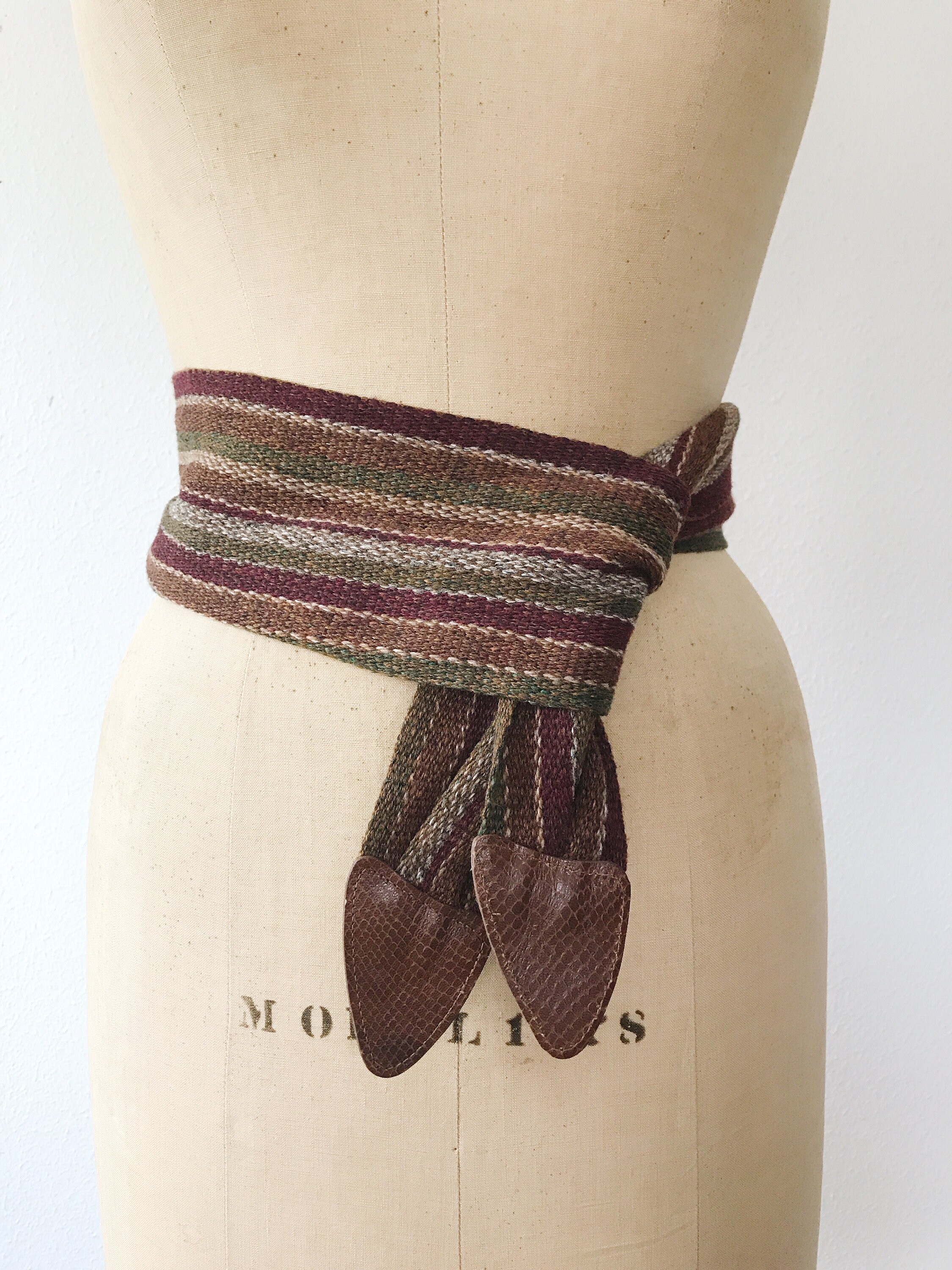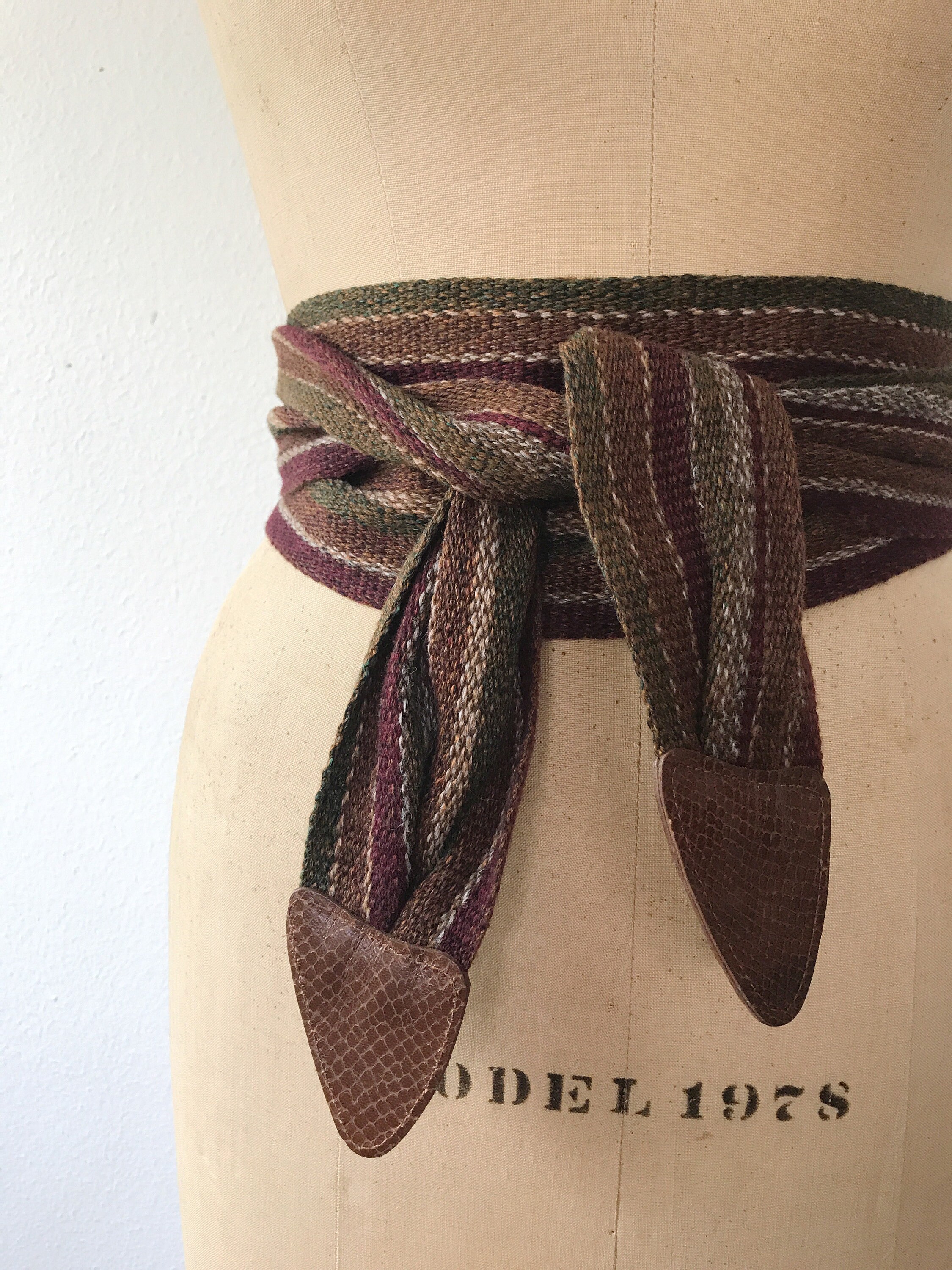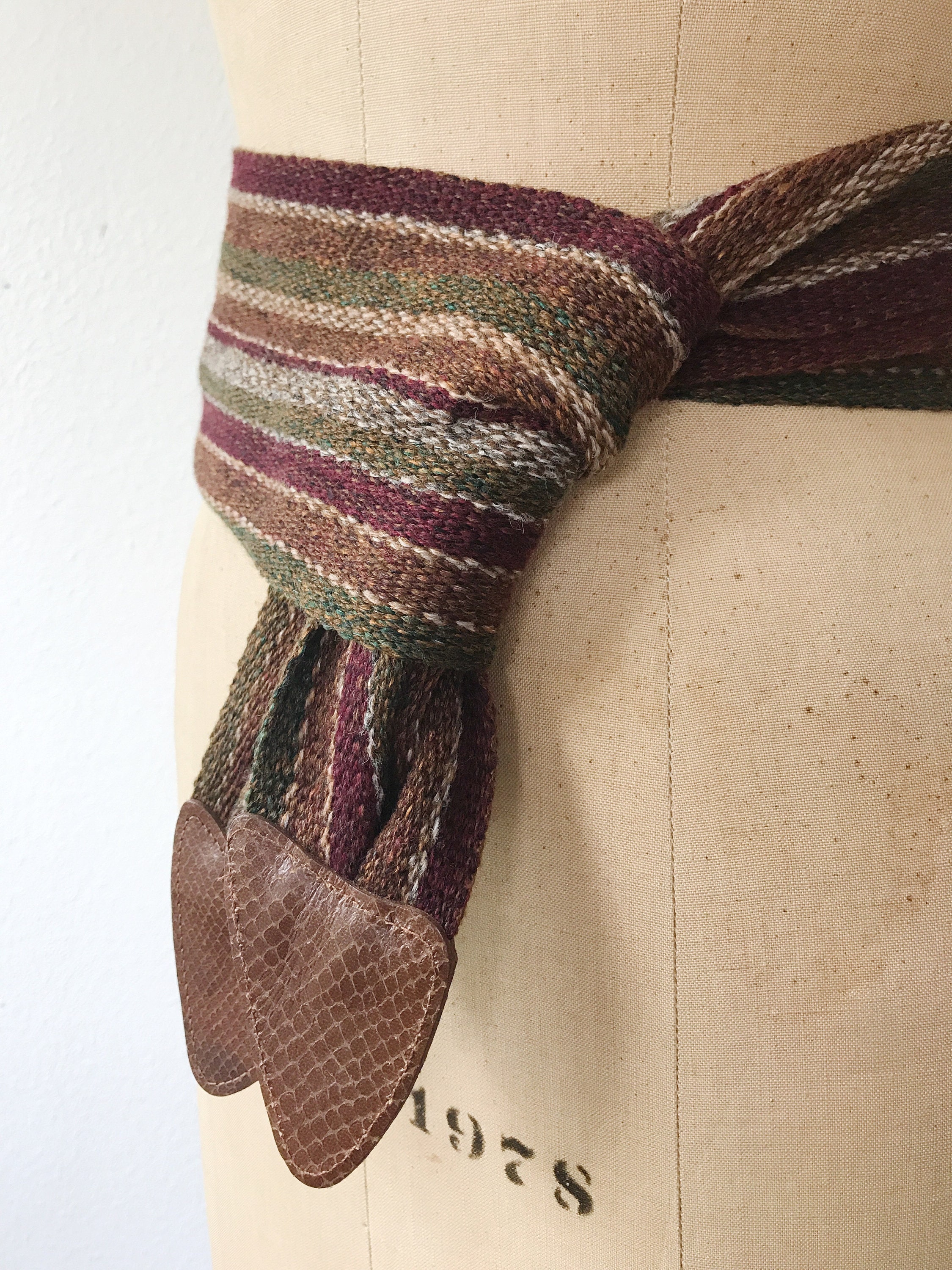 80s vintage woven cotton belt with snake embossed leather tips