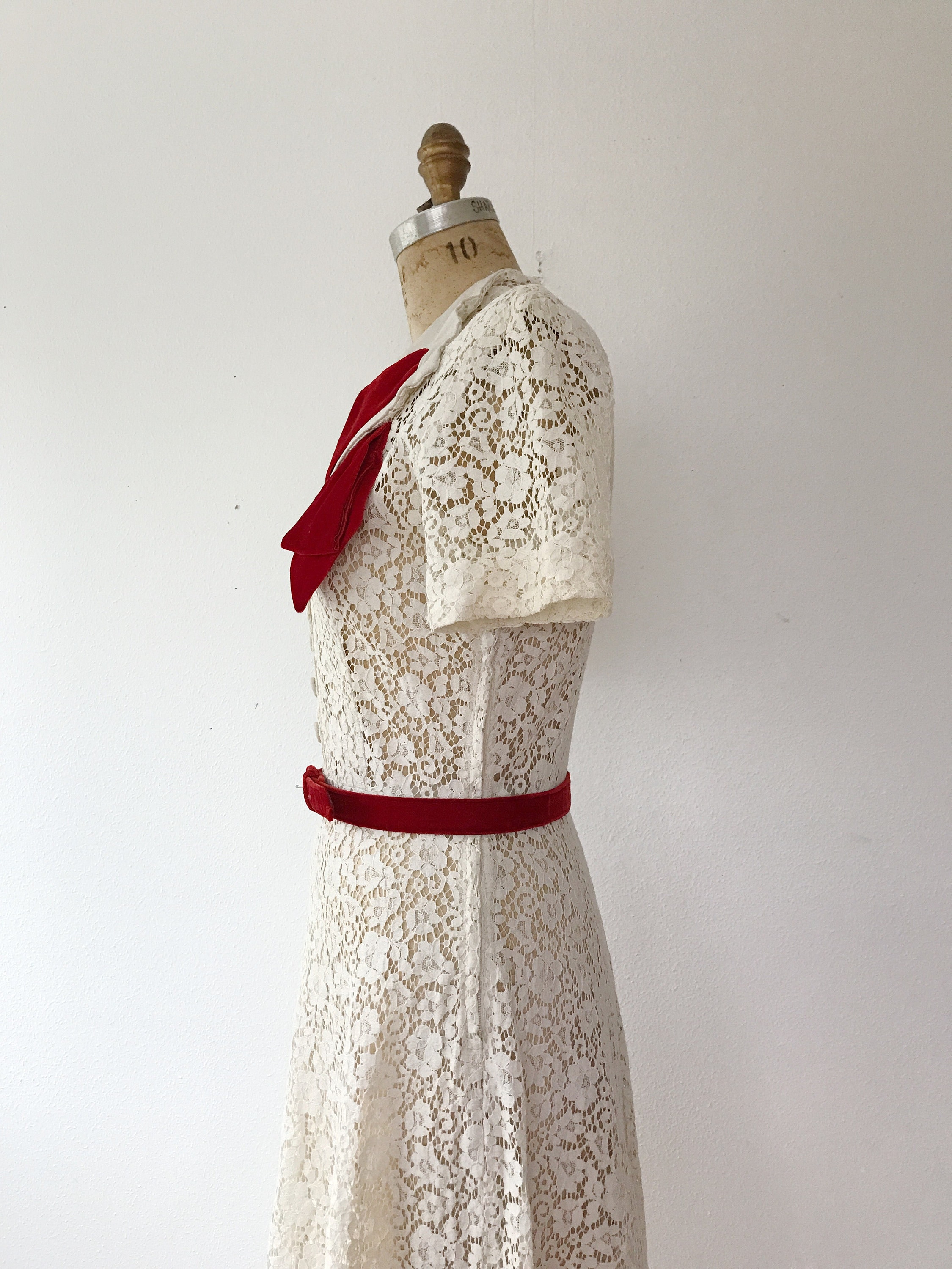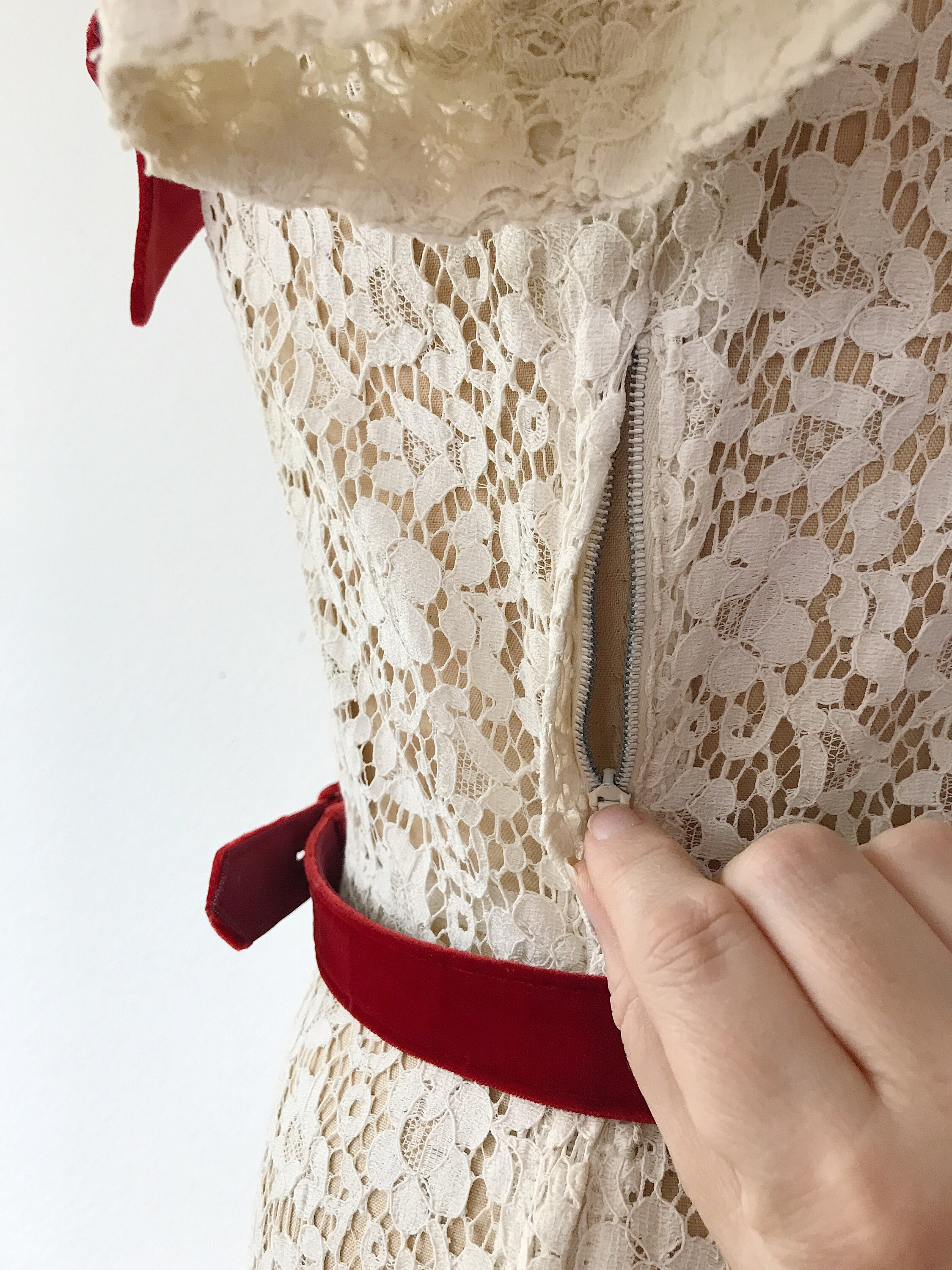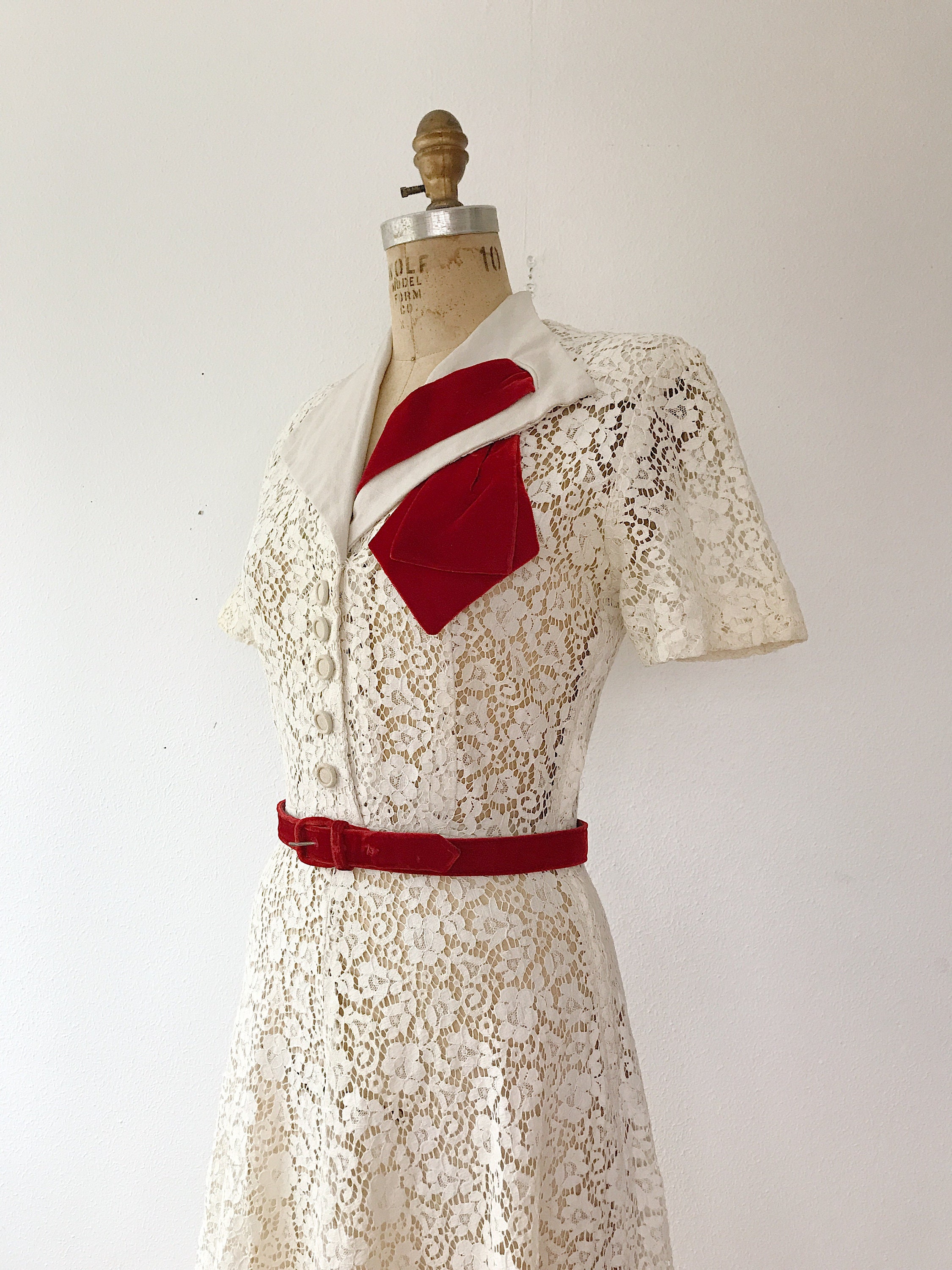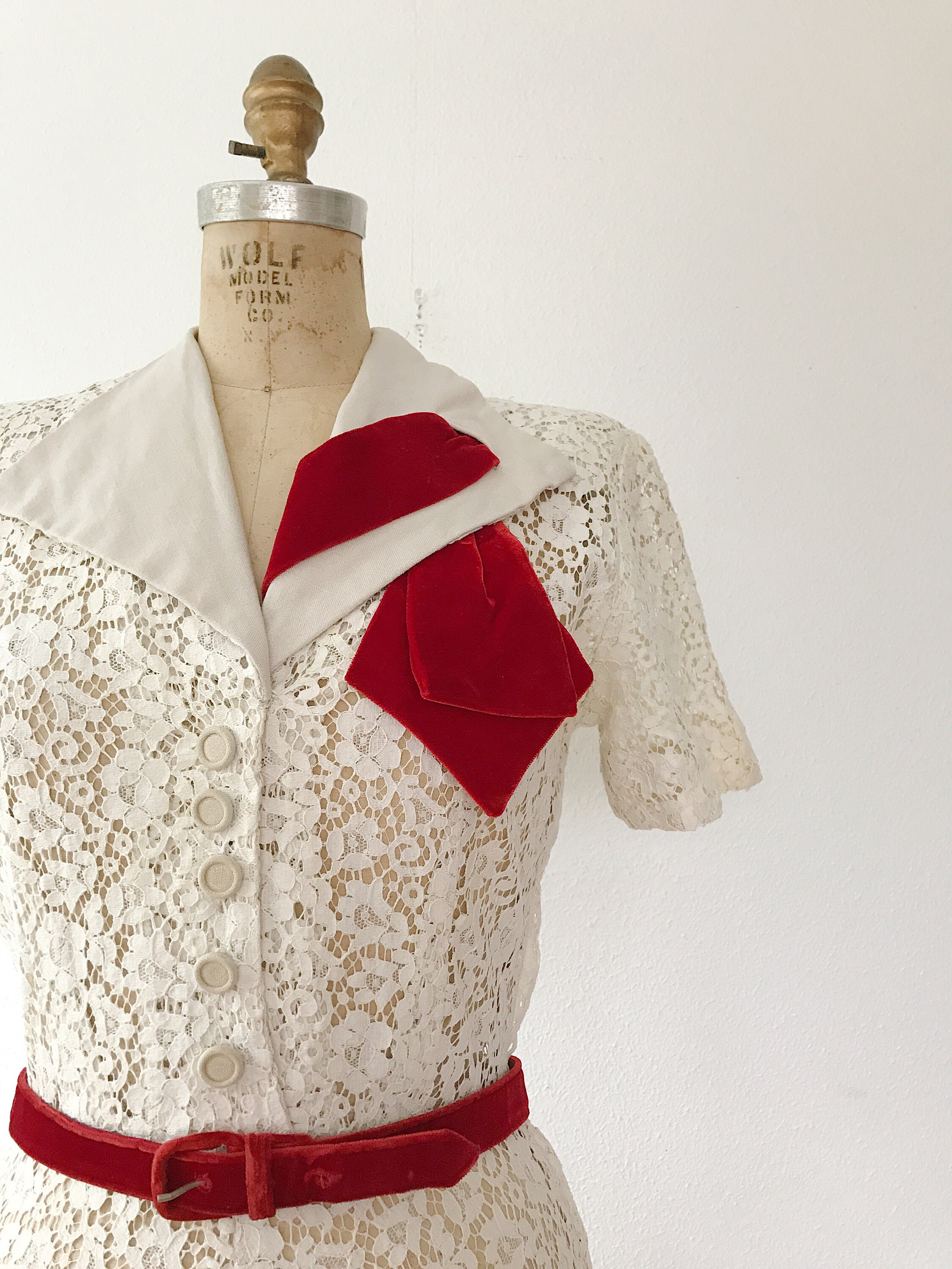 late 40s early 50s- this dress was horribly stained, but she now looks excellent, only a slightly darker shade of cream exists where the lace is doubled up (sleeve cuffs) (last photo) presents excellent!