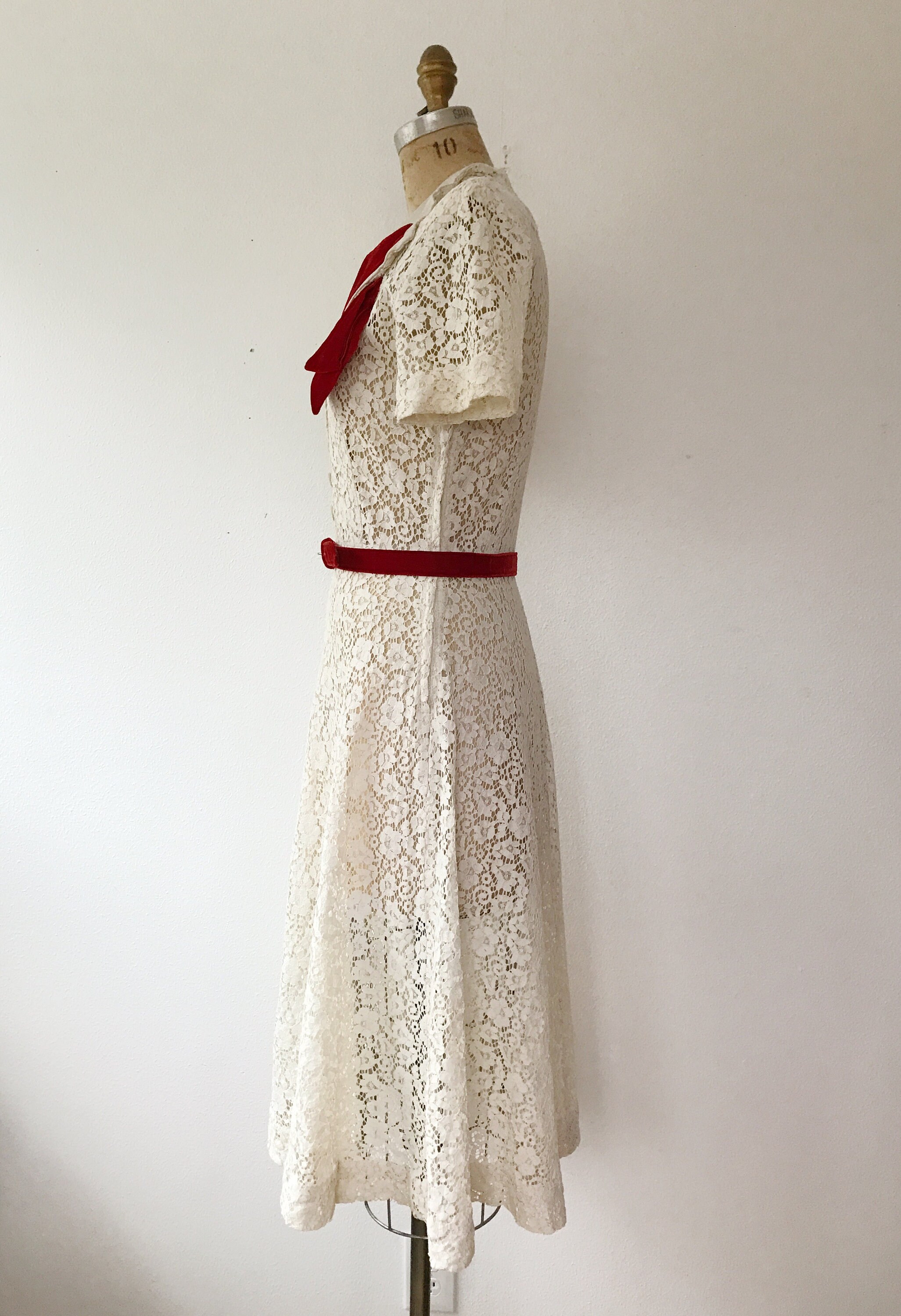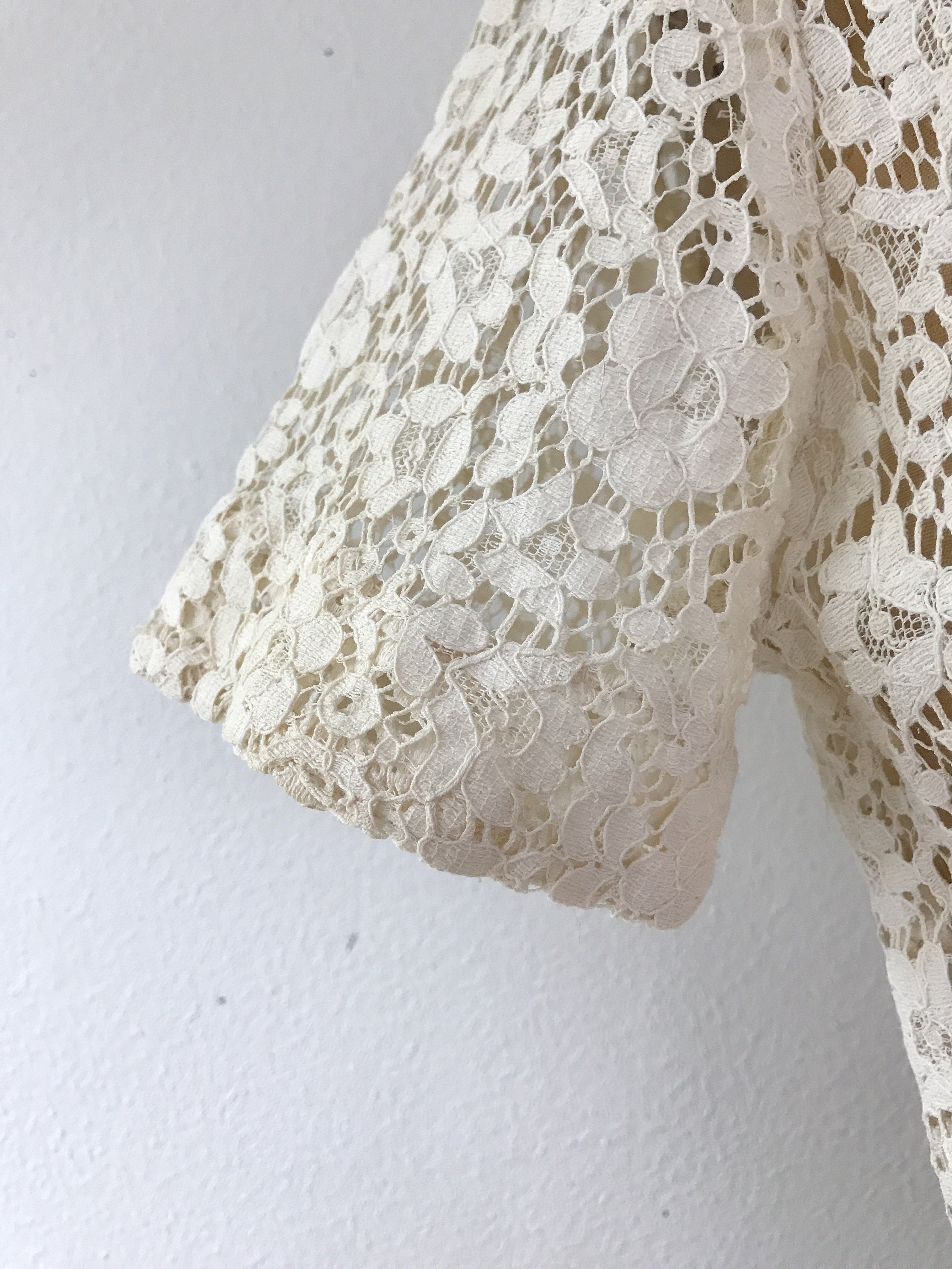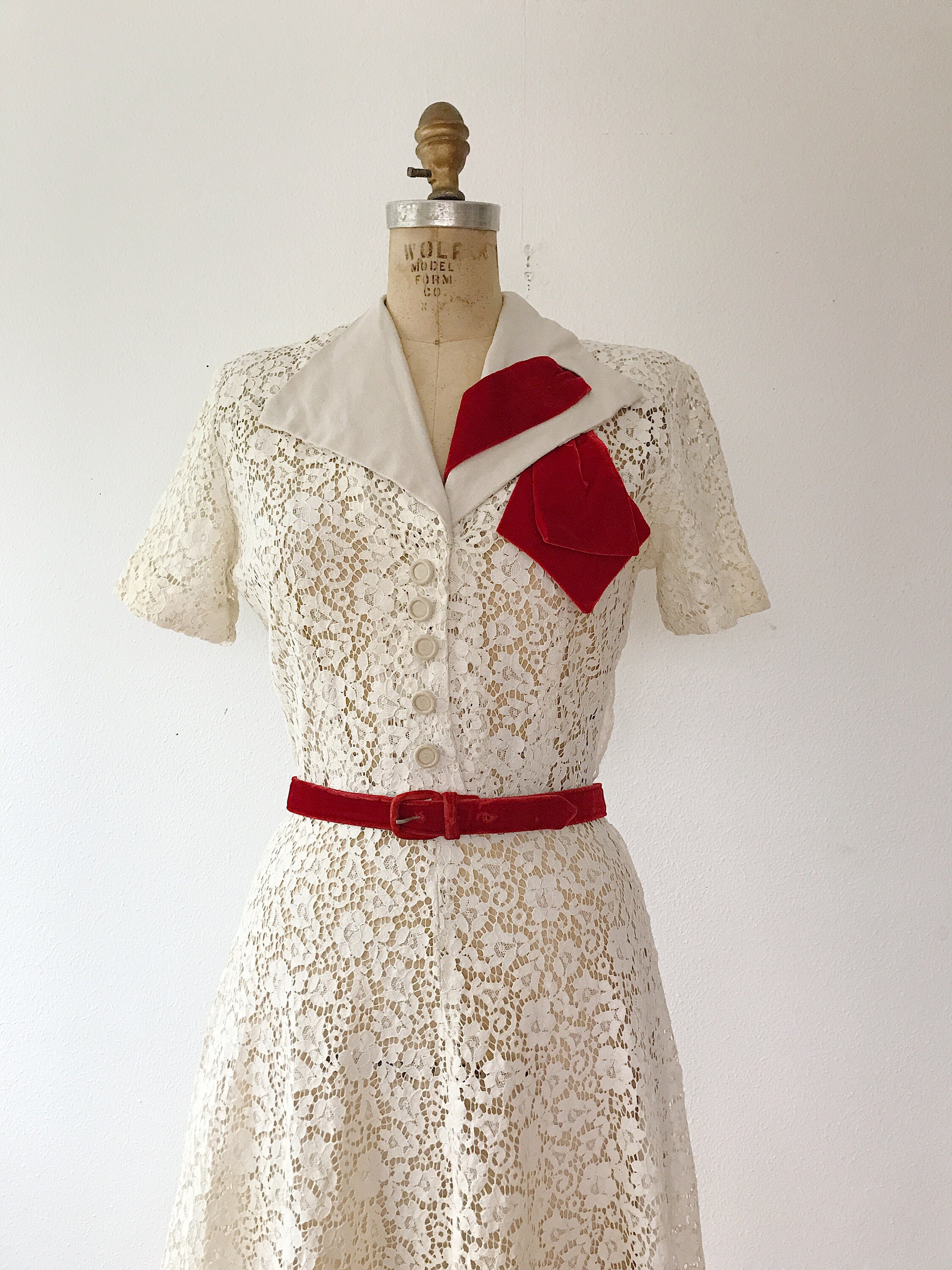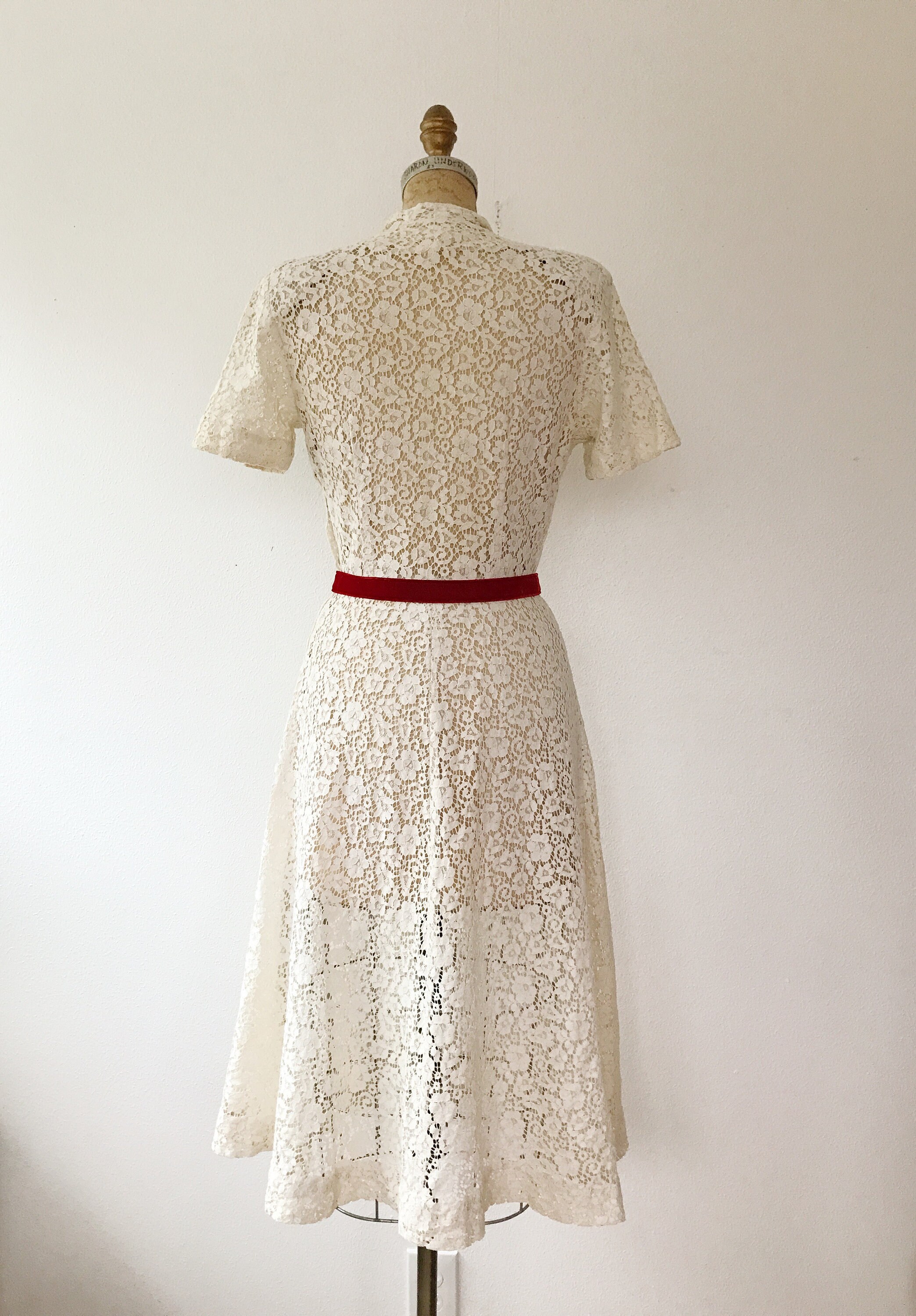 late 40s early 50s- this dress was horribly stained, but she now looks excellent, only a slightly darker shade of cream exists where the lace is doubled up (sleeve cuffs) (last photo) presents excellent!