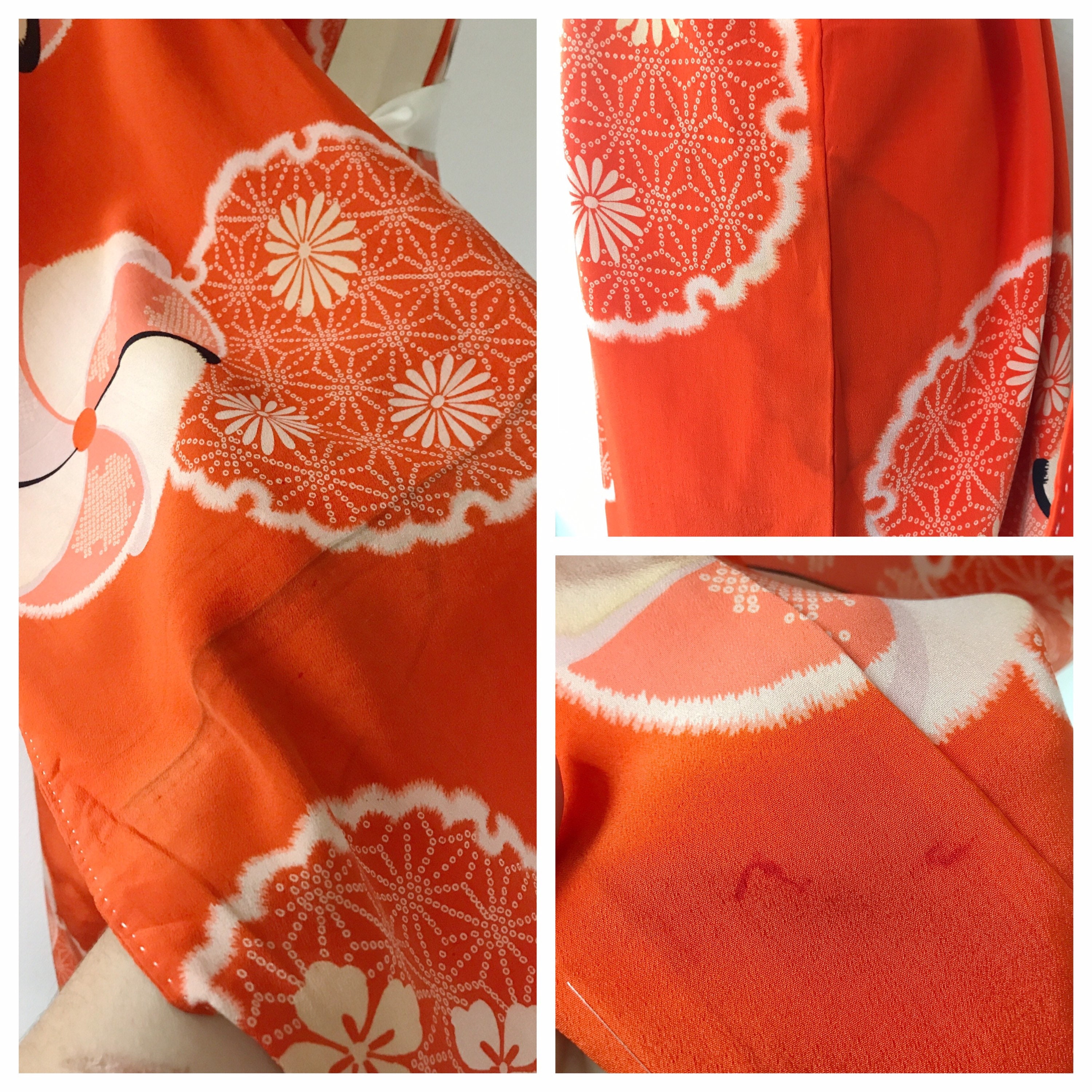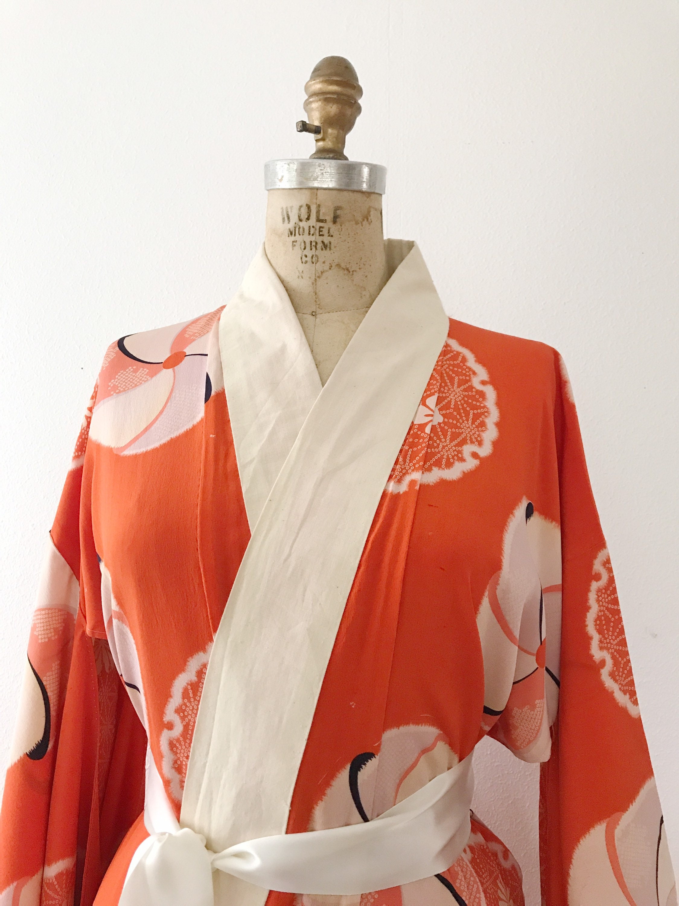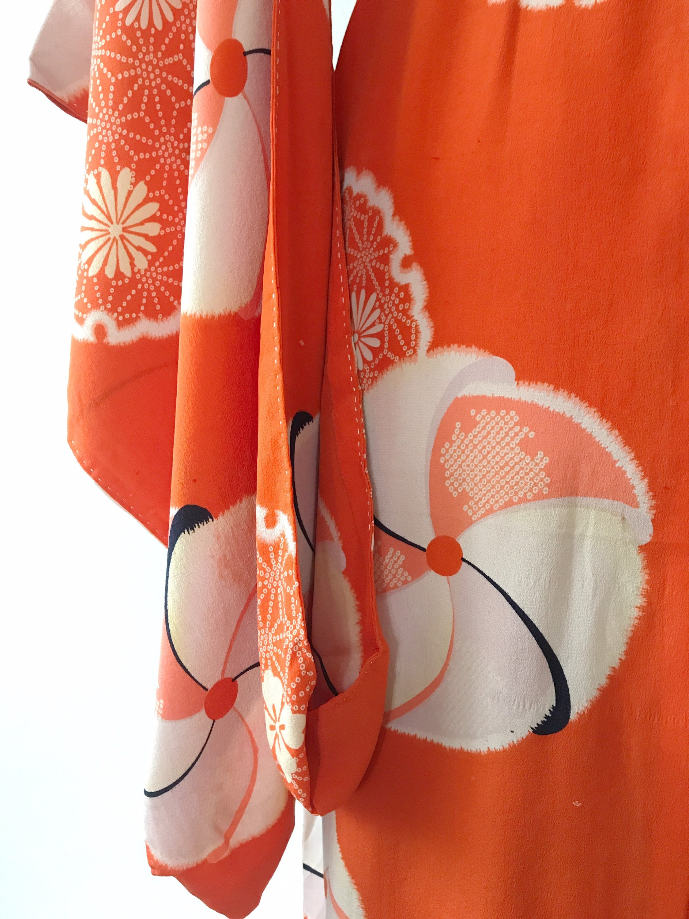 This particular vermillion orange Juban is from the 1930s with an Art Decp print, large flowers and floating spheres of Shibori print. The overall floral pattern has very light cream, yellow and lilac colors against black accents.