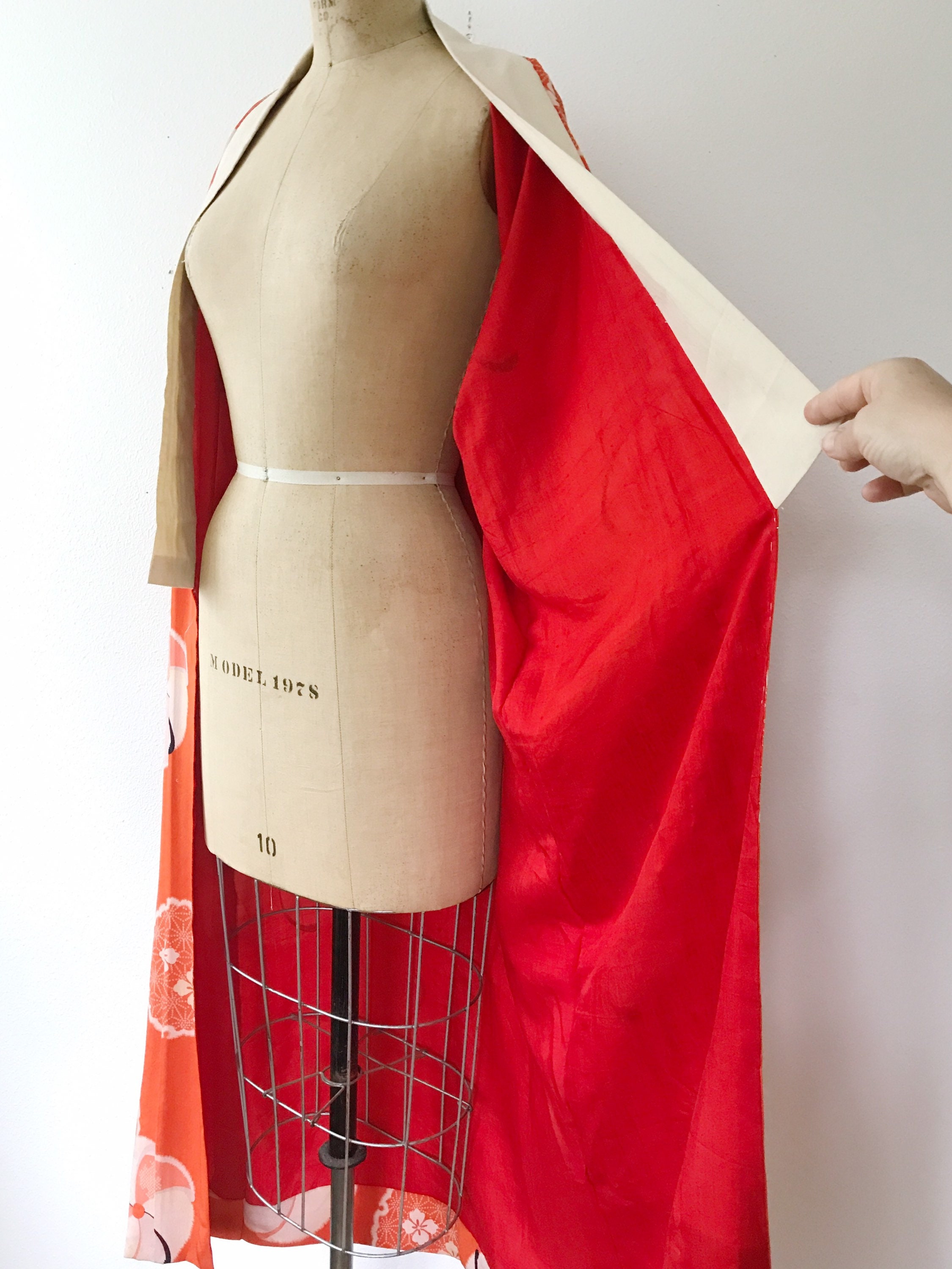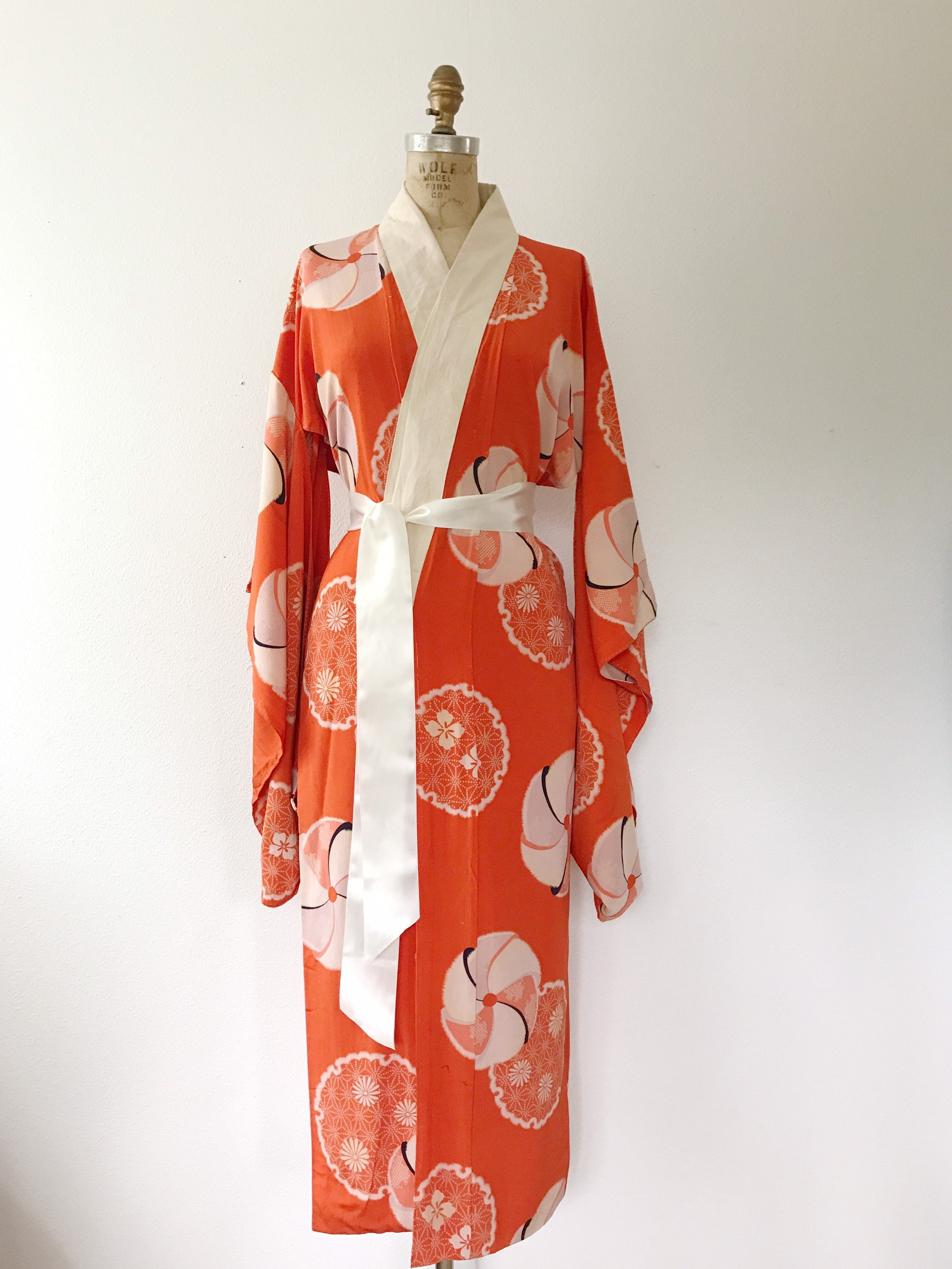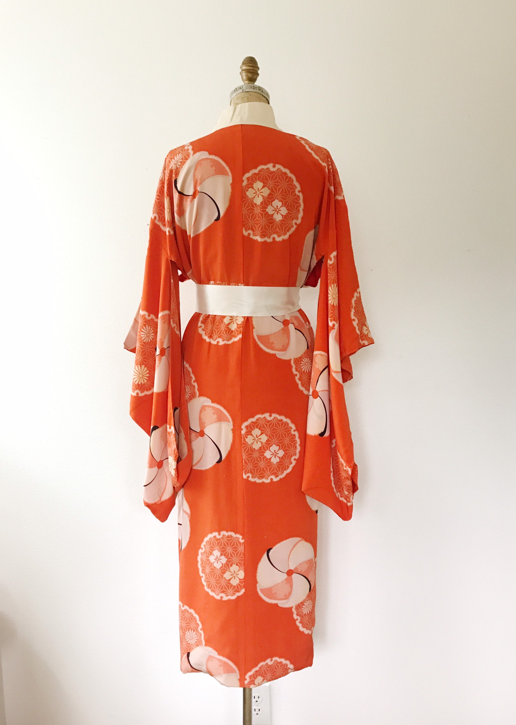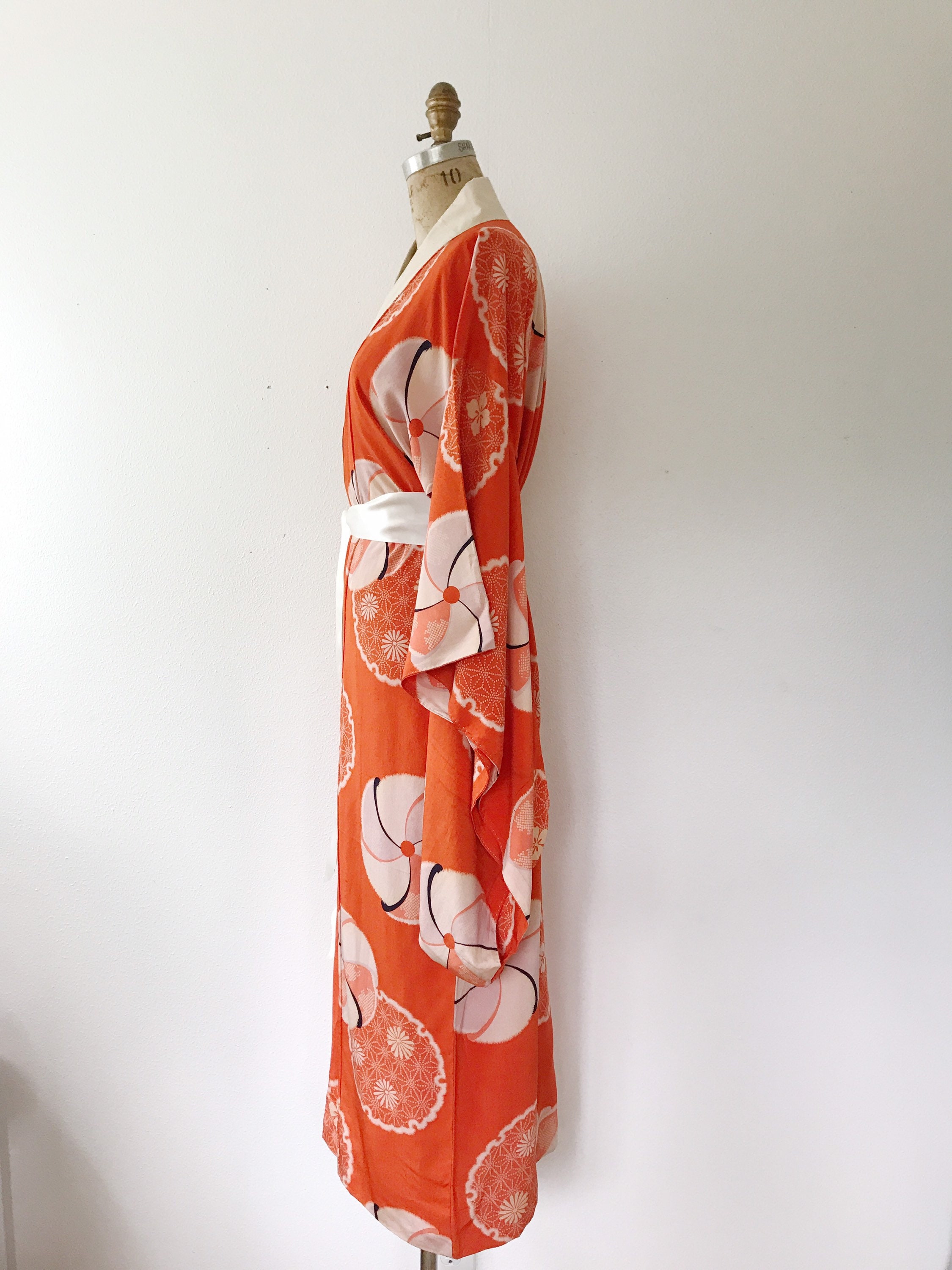 This particular vermillion orange Juban is from the 1930s with an Art Decp print, large flowers and floating spheres of Shibori print. The overall floral pattern has very light cream, yellow and lilac colors against black accents.